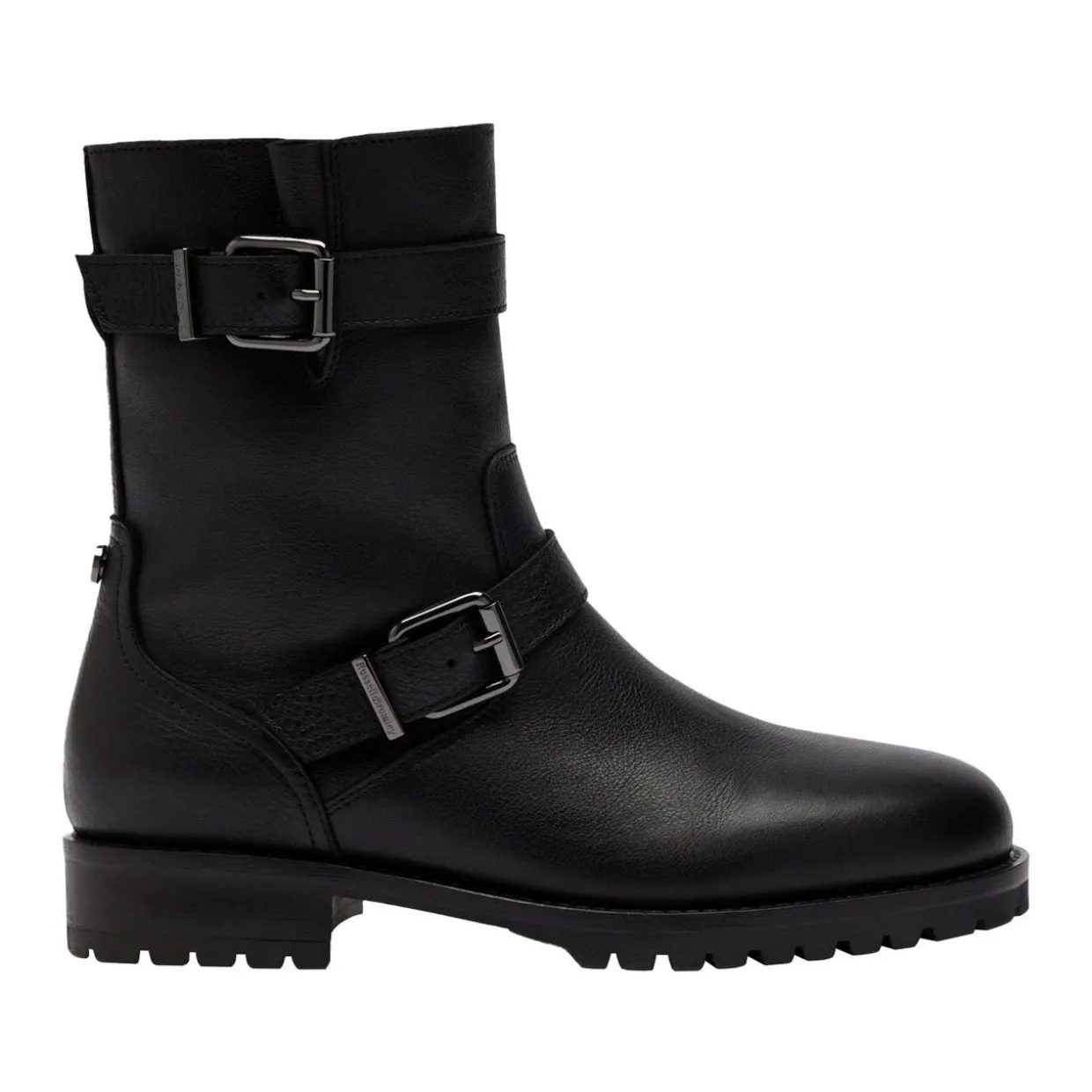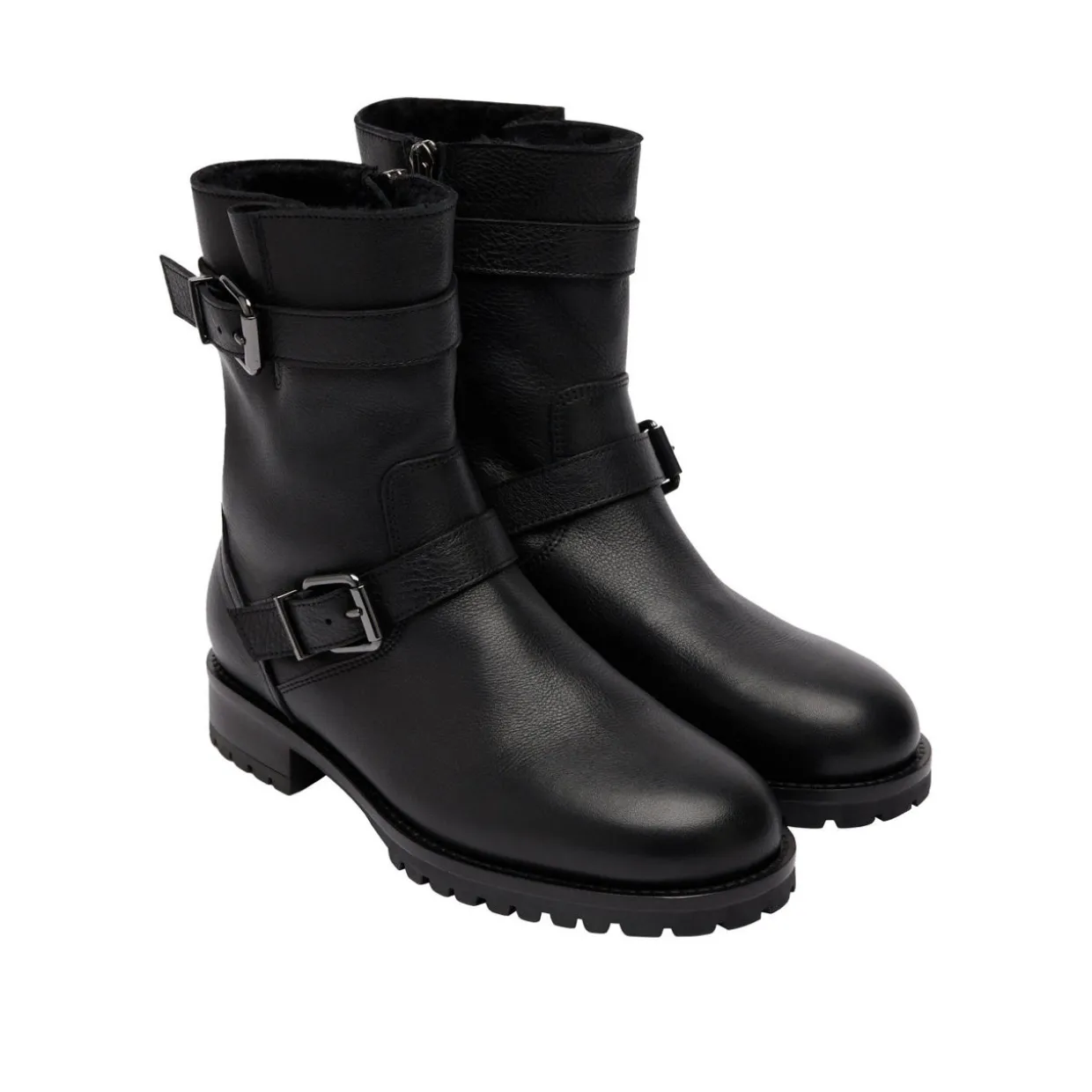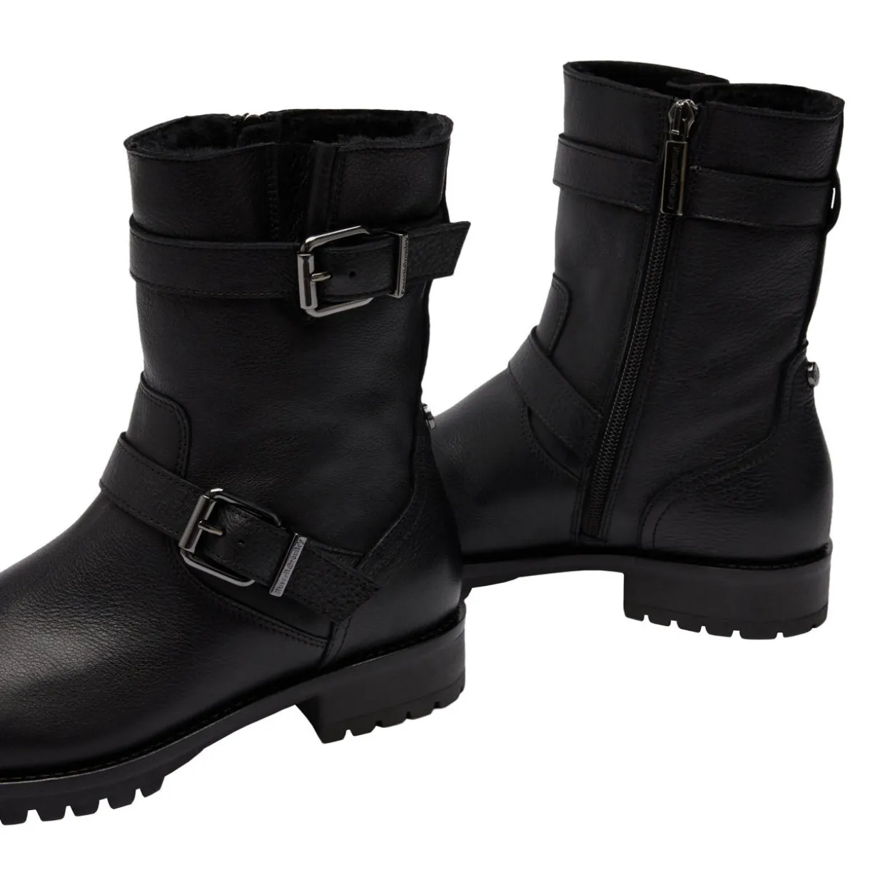 - Leather upper, buckle strap detailing, faux-fur lining, biker style, side-zip fastening, cleated sole, round toe, brand logo detail