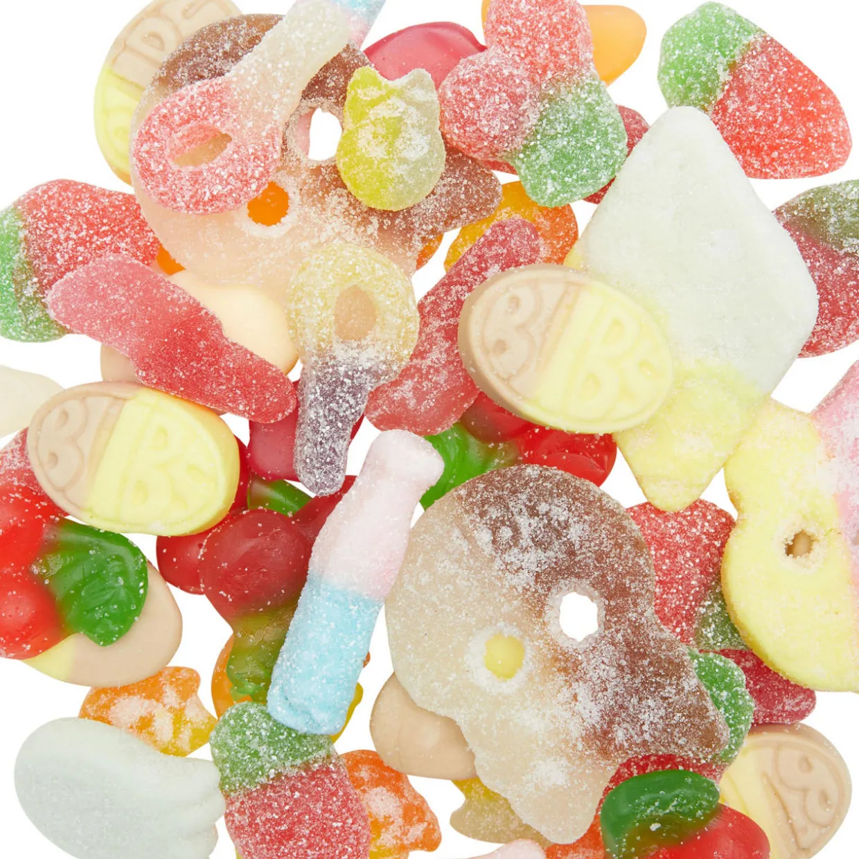 - Ingredients: Sugar, Glucose Syrup (Sulphites), Corn Starch, Maize, Water, Acids (Citric Acid, Malic Acid), Acidity Regulator (E129, E102, E132, E133, E171, E331),Acids: E270, E296, E330; Gelling Agent: Pectin; Concentrated Fruit Juice (Apple, Grape, Pear), Black Carrot Juice Concentrate, Grape Concentrate, Flavourings, Food Colouring (Concentrate of Spirulina and Safflower), Colours (E129, E102, E110, E100, E160c). Vegetable Oil, (Coconut), Glazing Agent