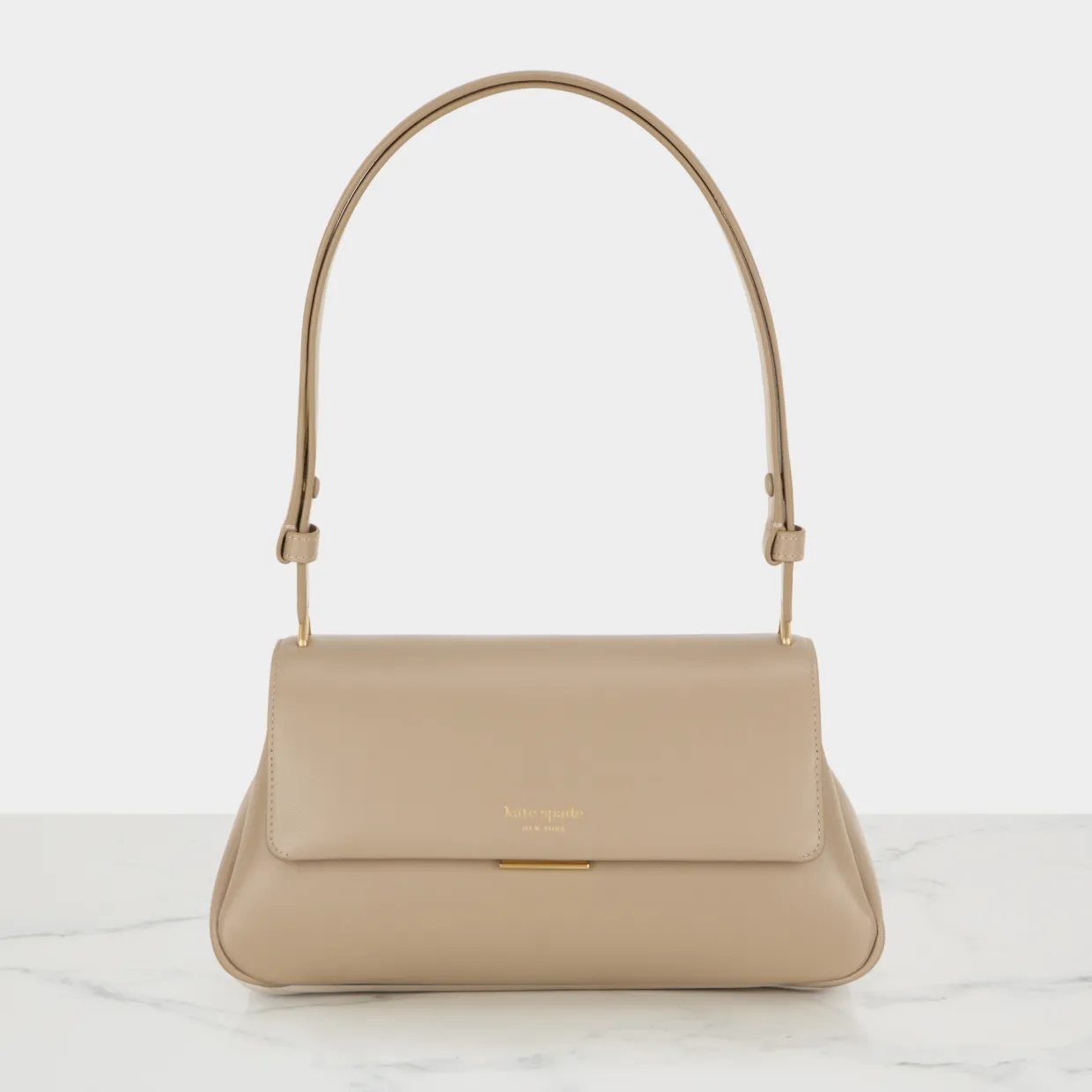 - Flap closure with push lock fastening, gold-tone hardware, adjustable shoulder strap, one exterior slip pocket, foil embossed logo detail, smooth finish