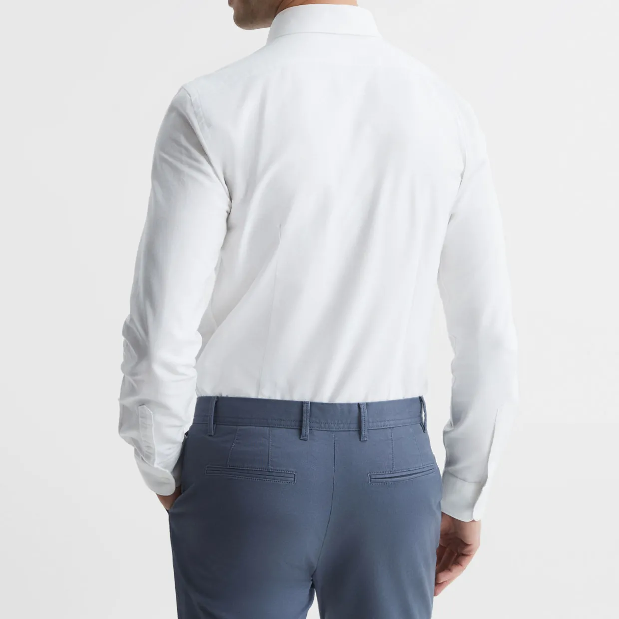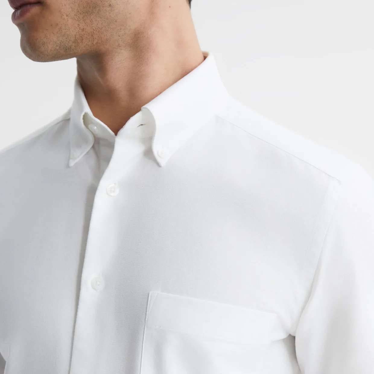 - Two-ply cotton, Oxford style, soft-wash finish, button-down collar, patch pocket to left chest plate, long sleeves, buttoned cuffs, slim fit