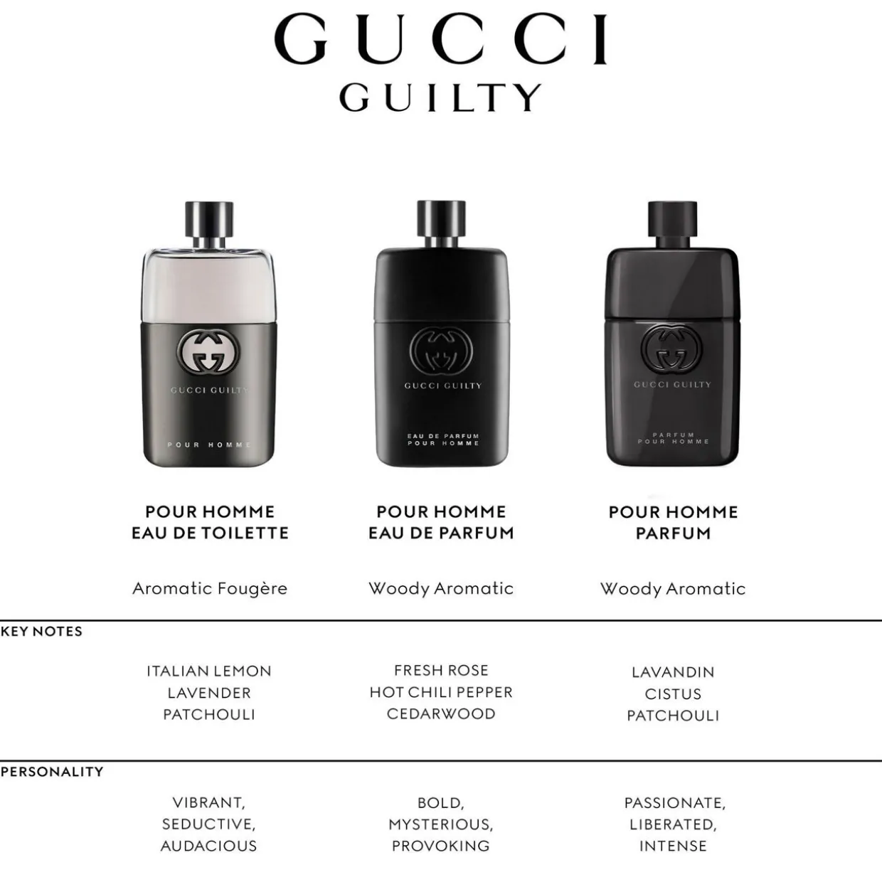 A woody aromatic fragrance, Gucci Guilty For Him Parfum opens up with notes of French Lavender, magnified at the heart with the deep ambery signature nuance of Cistus, combined with the mysterious elegance of Patchouli.