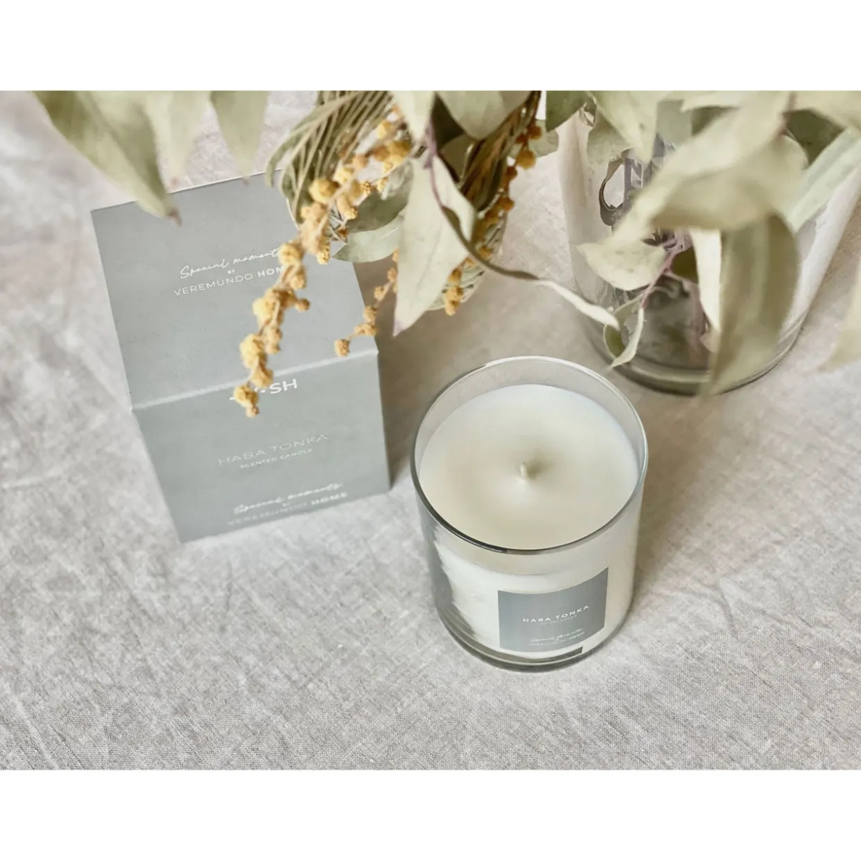 - 91% vegetable wax and 9% perfume, features a clear glass container with a wooden lid, and a cotton wick. Habatonka fragrance with a floral and woody aroma