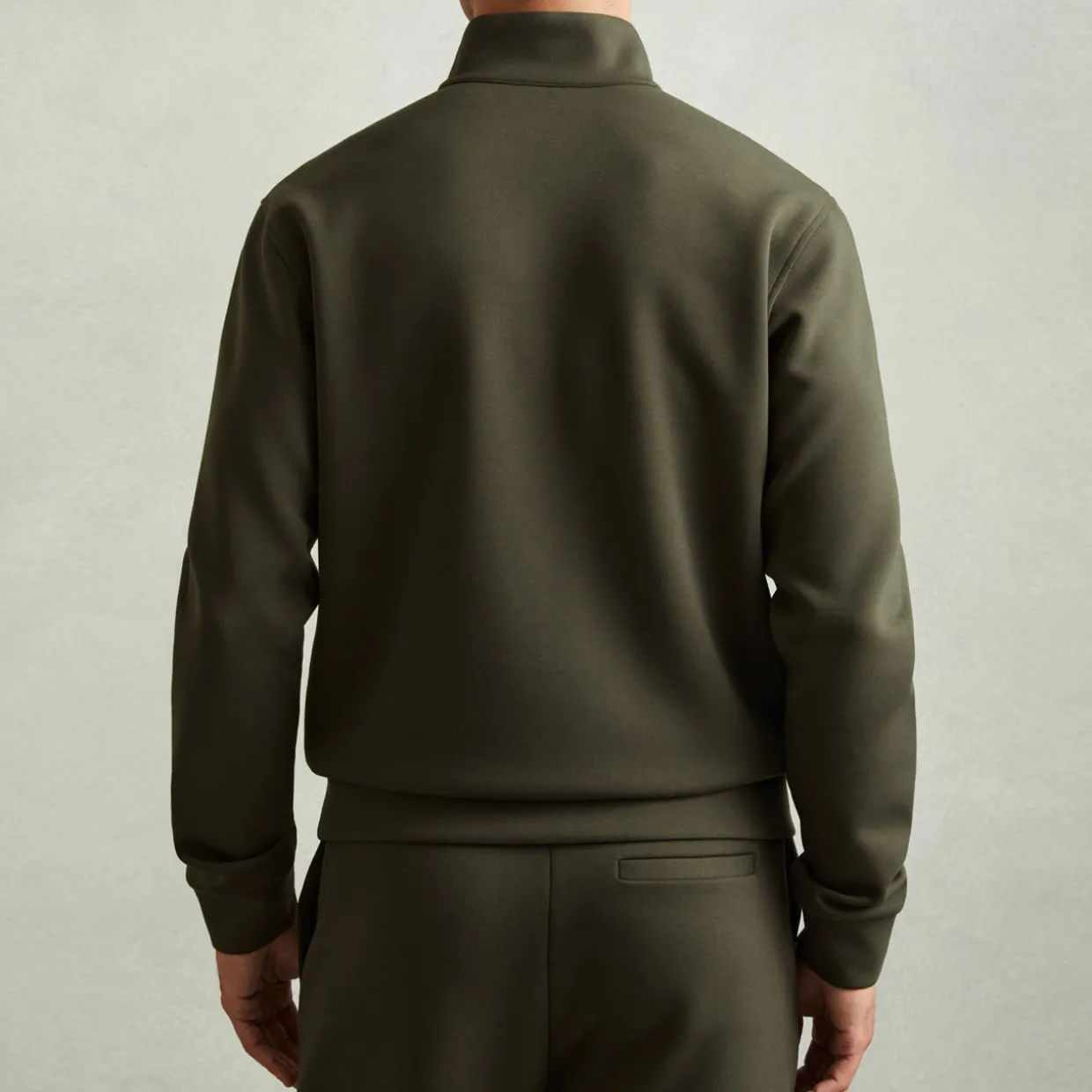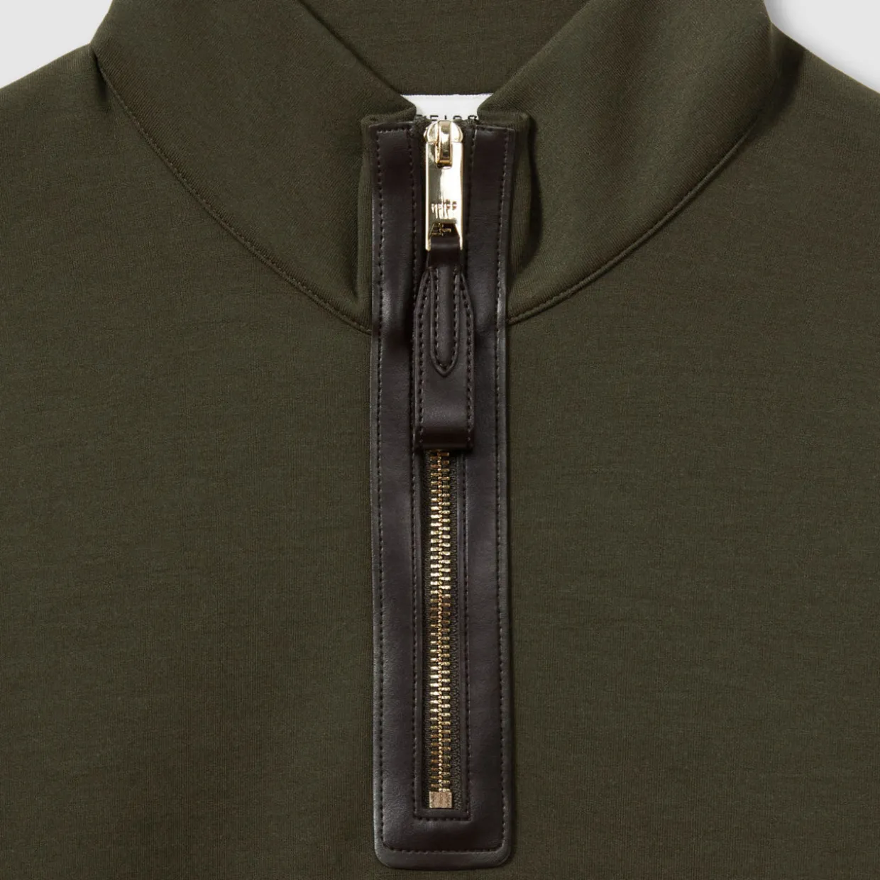 - High neckline, half-zip fastening, long sleeves, ribbed trims, leather zip pull
