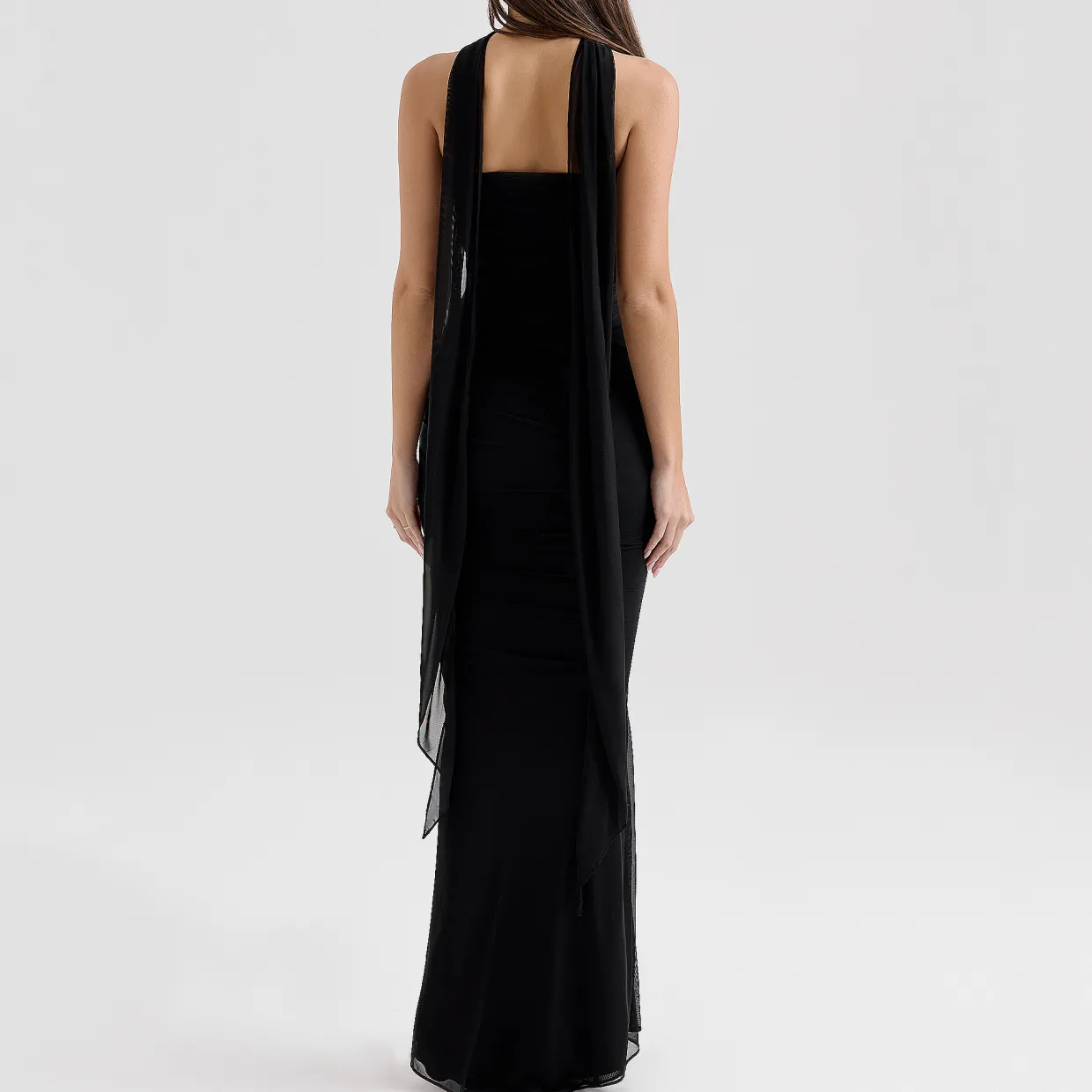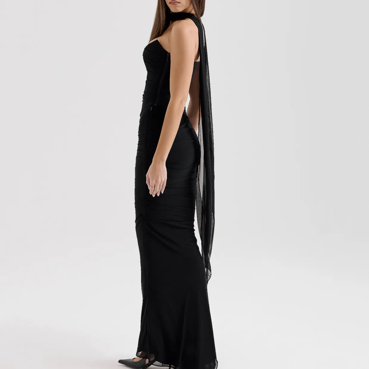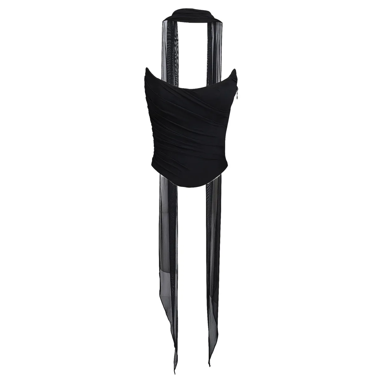 - Ruched overlay, boned corset, neck scarf, zip fastening