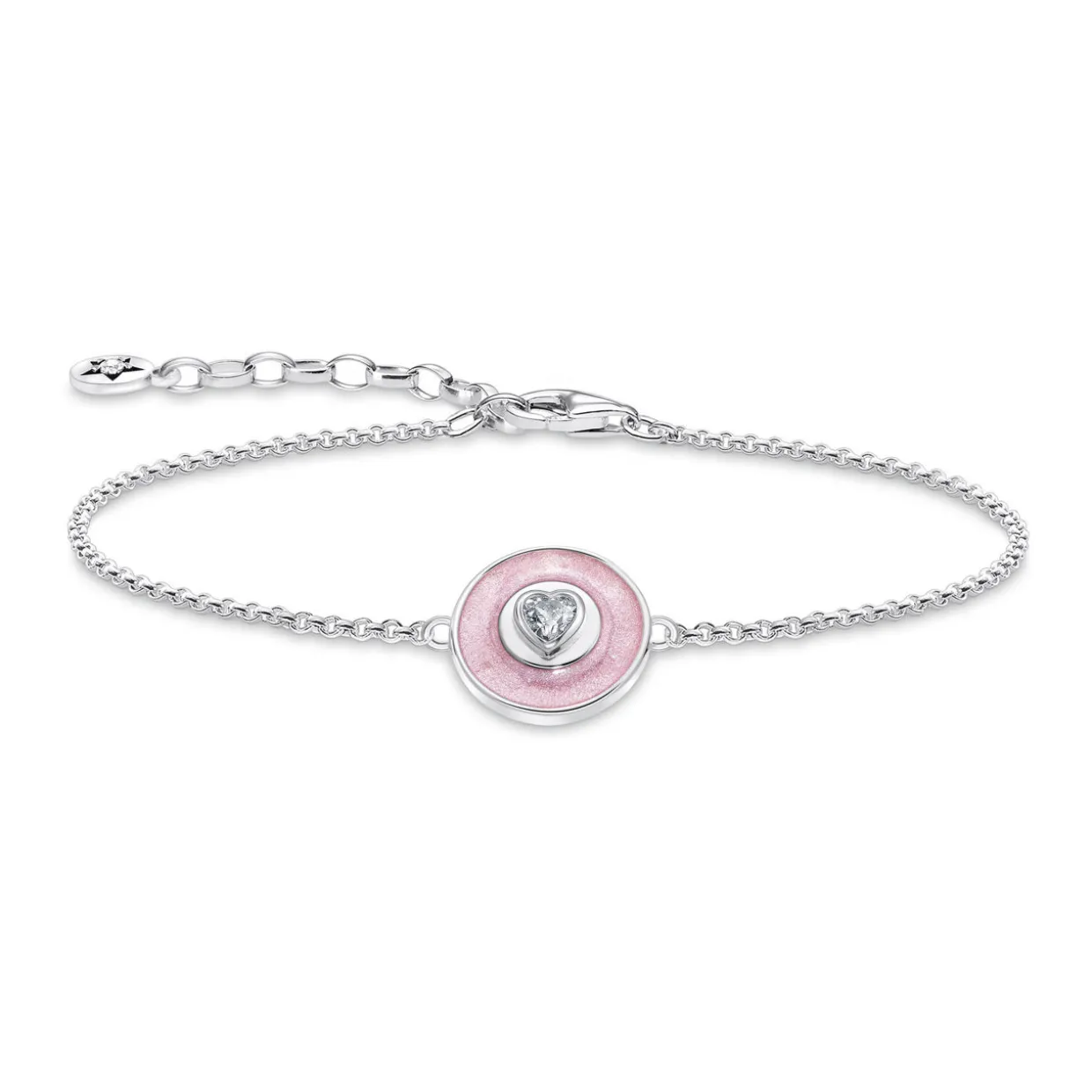 - Heart-shaped zirconia detail, circular pendant, pink enamel detailing, cable chain, lobster clasp fastening, adjustable length