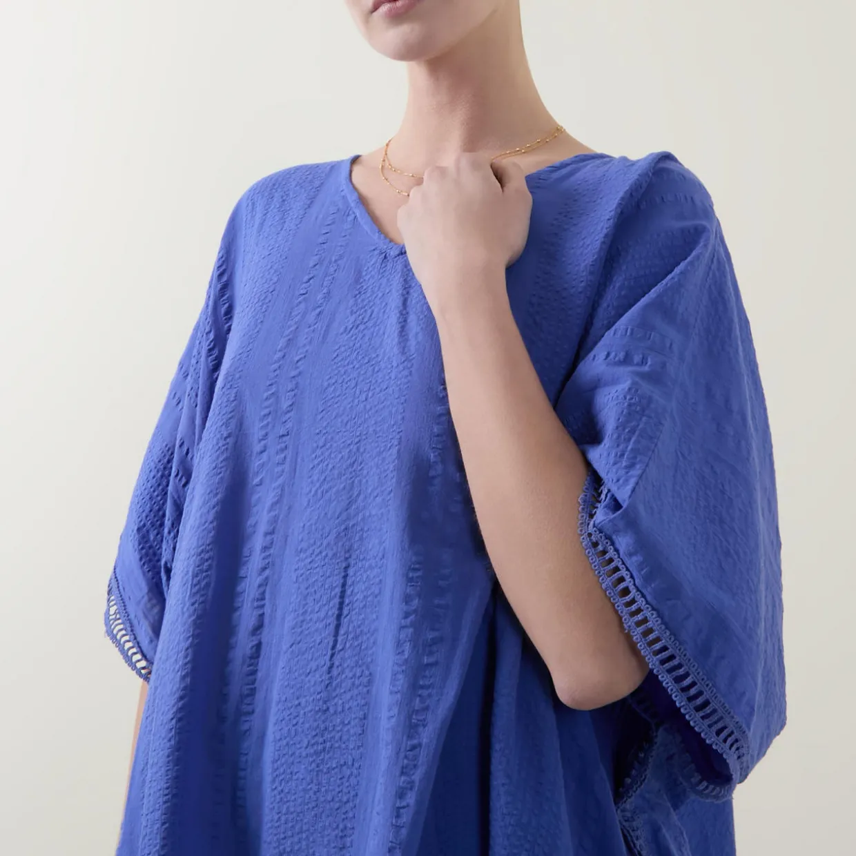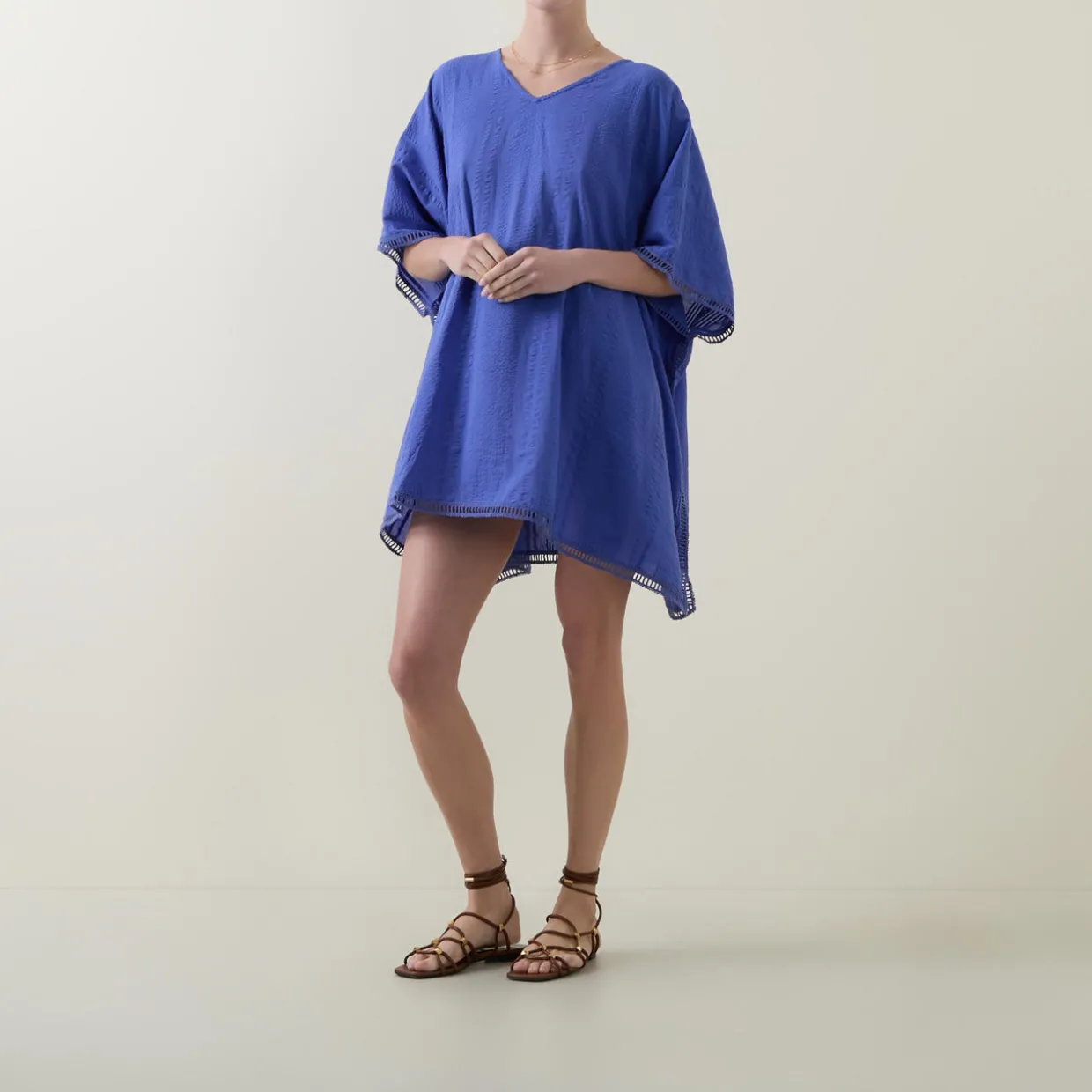 - V-neckline, wide short sleeves, asymmetric hem, laddered design, cut-out trim detailing, lightweight, breathable