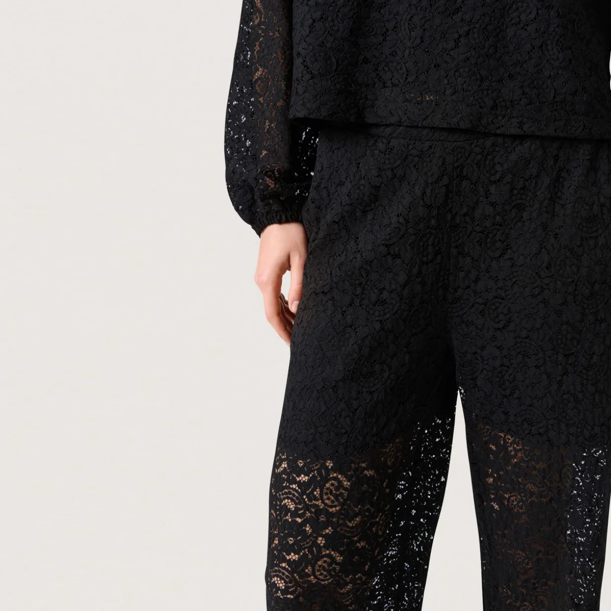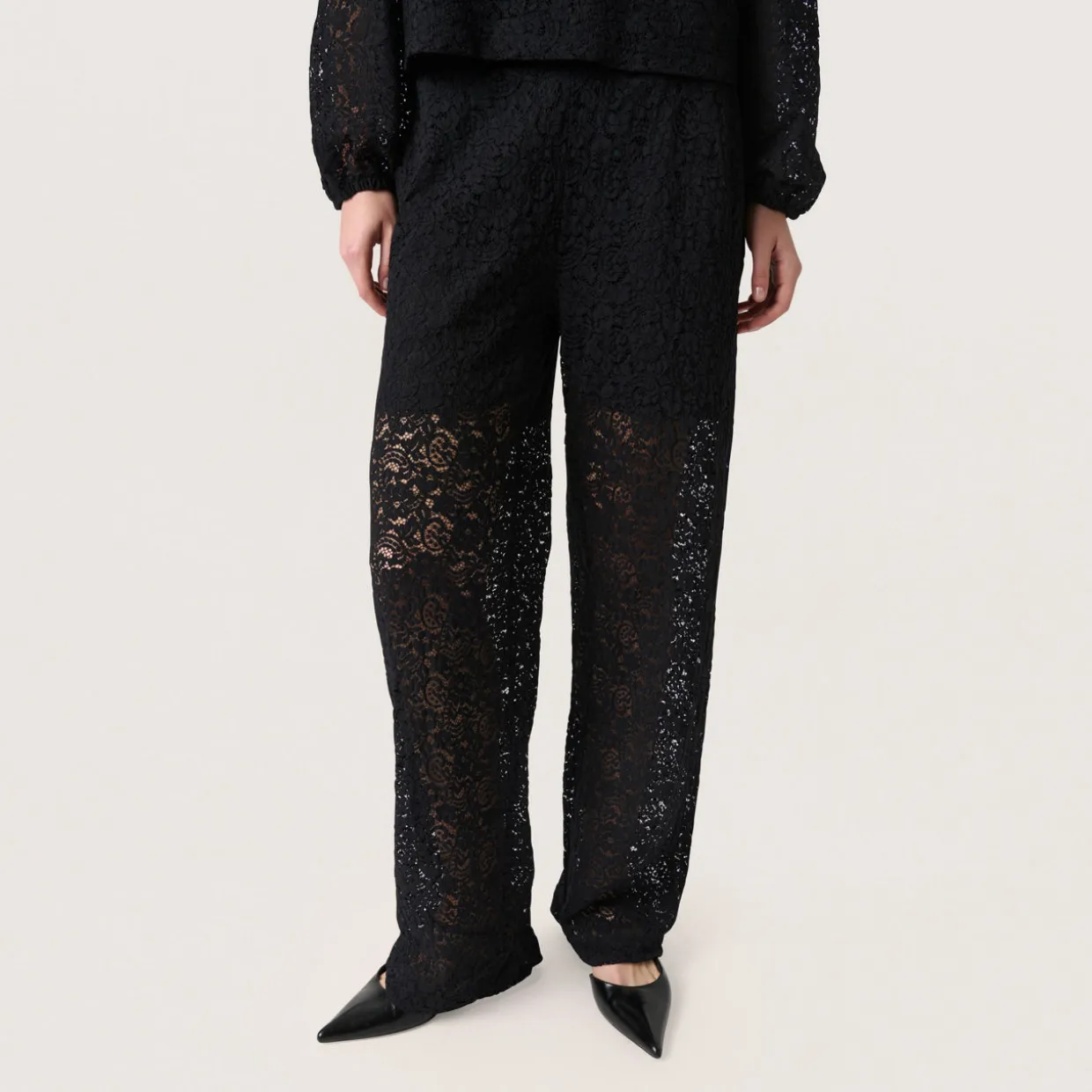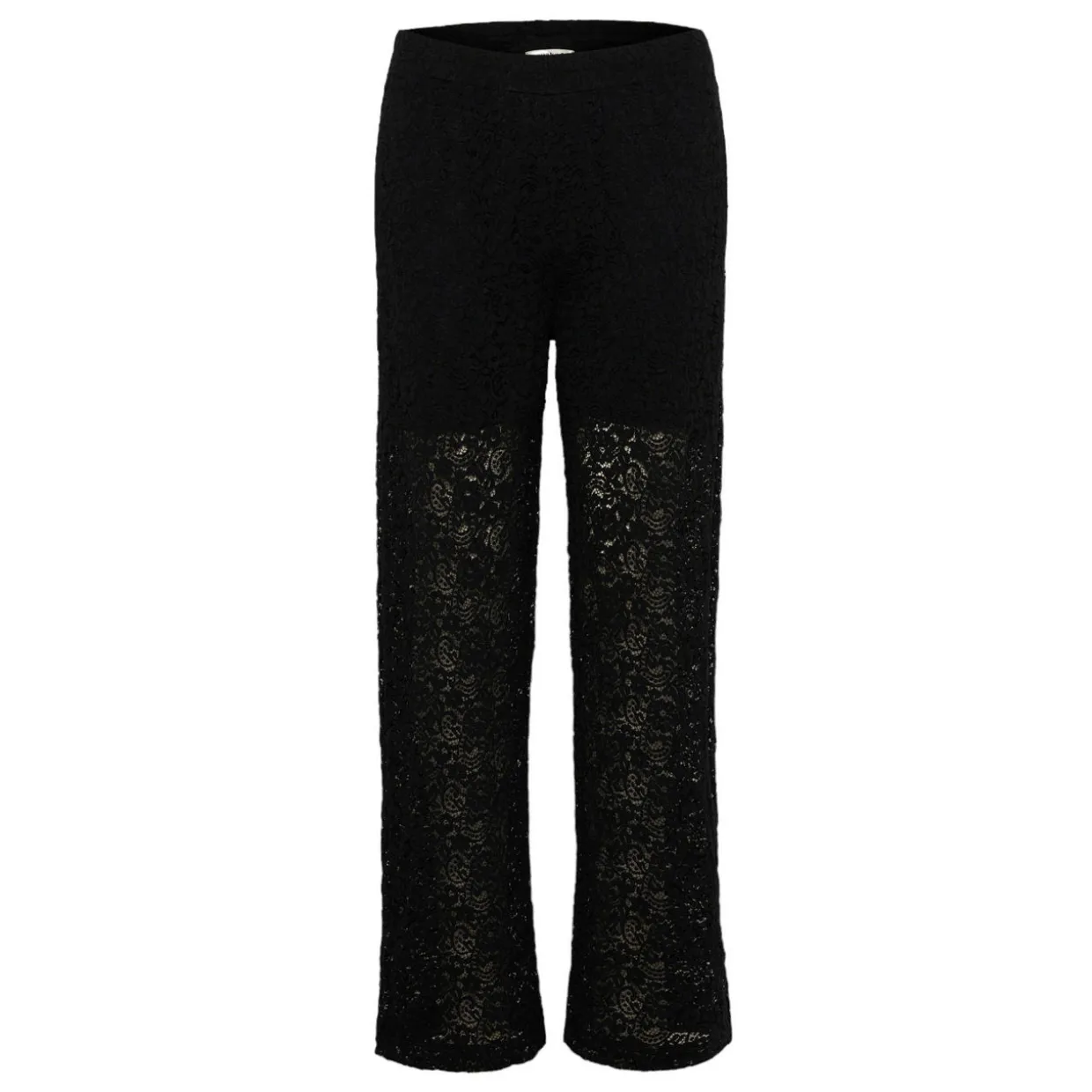 - Mid-rise, straight-leg, pull-on style, covered waistband, clean hems, all-over lace design, half-lined