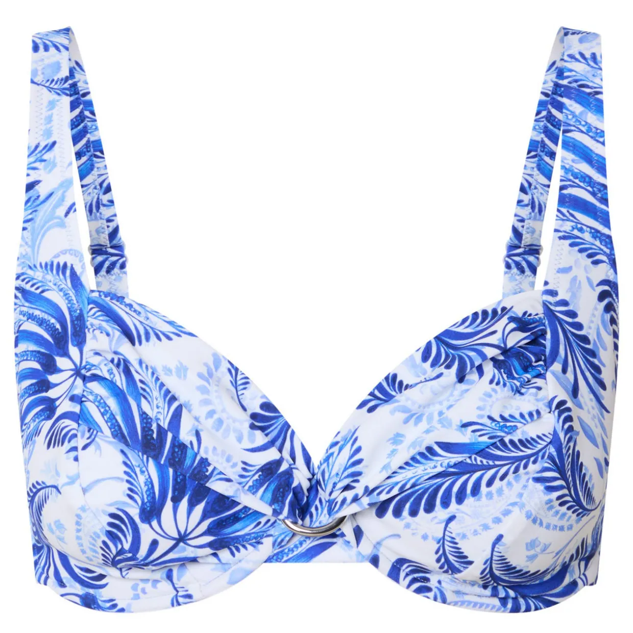- Adjustable straps, clasp closure, underwired, draped details, printed, decorative metal ring
