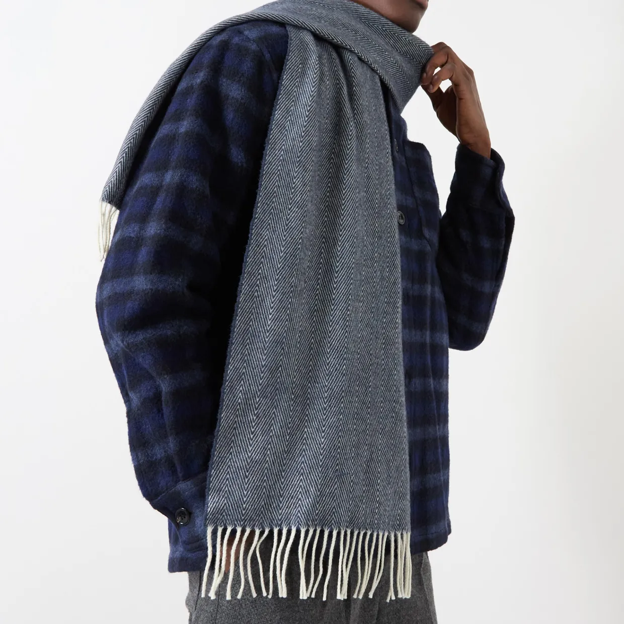 - Oblong style, knit structure, fringed trims, herringbone pattern, contrast embroidered logo detail
