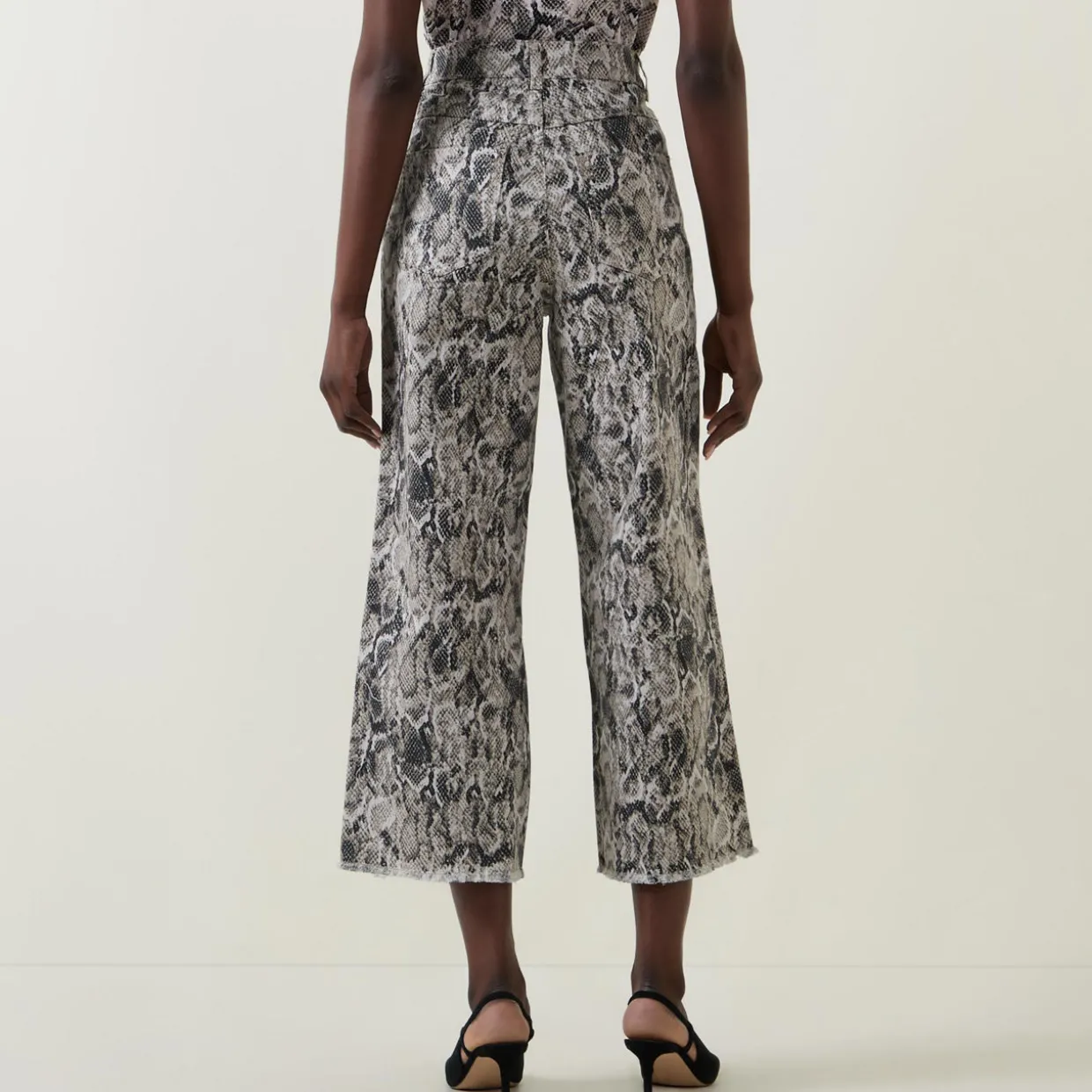 - Zip-fly and button fastening, two side in-seam pockets, two rear patch pockets, rear logo tag, snake print, high-rise, wide-cut leg, frayed edges