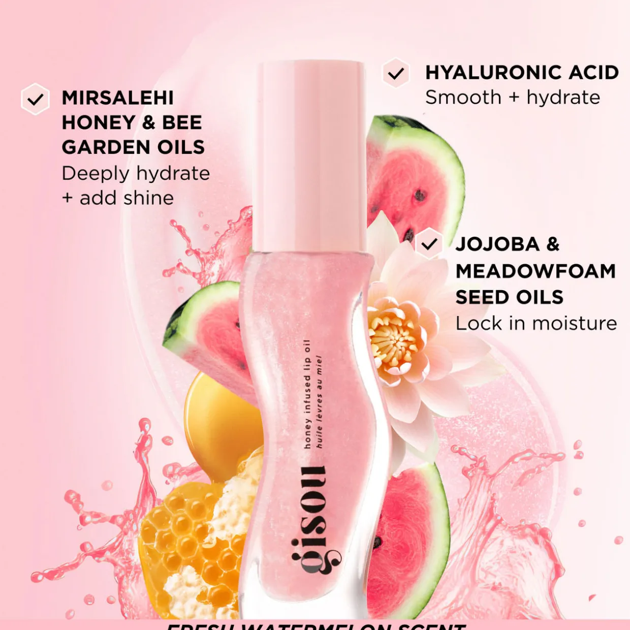 - Honey Infused Lip Oil in Watermelon Sugar: Pucker up and swipe on with the lip-hugging applicator for honey-kissed lips that shine with hydration.