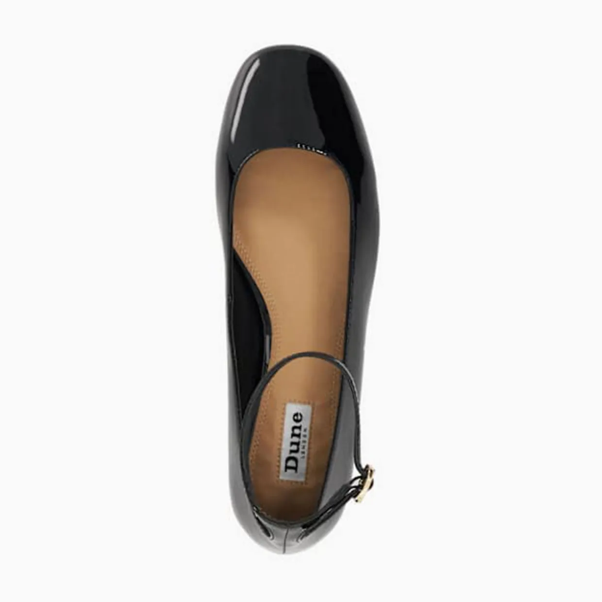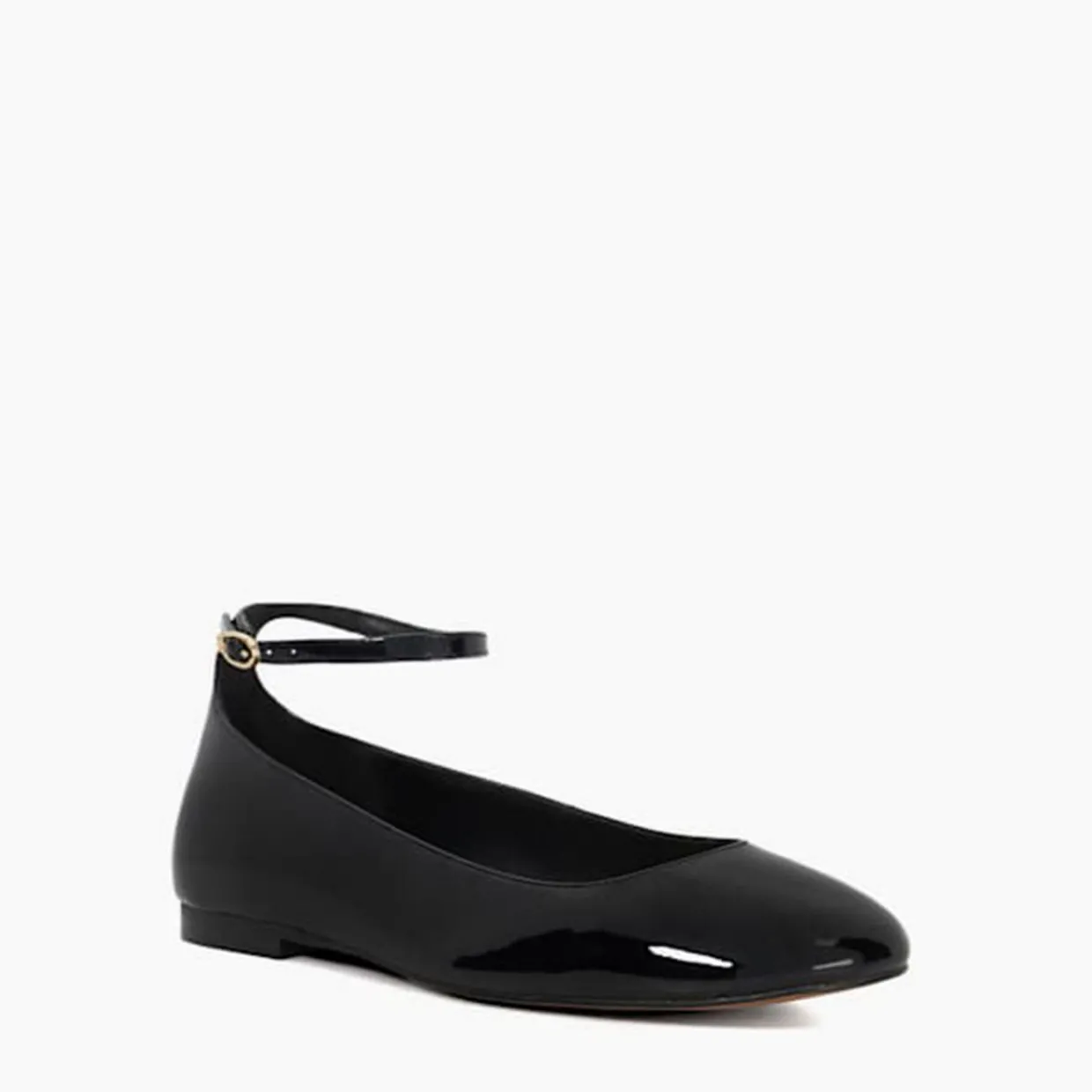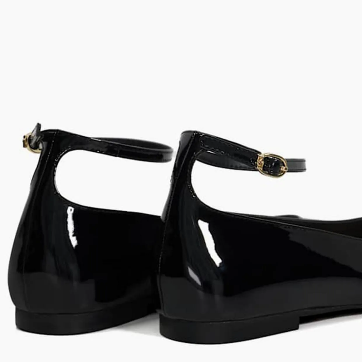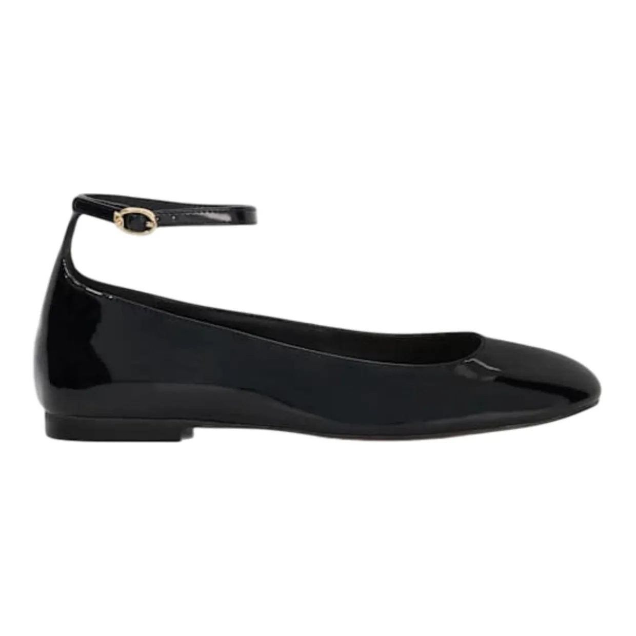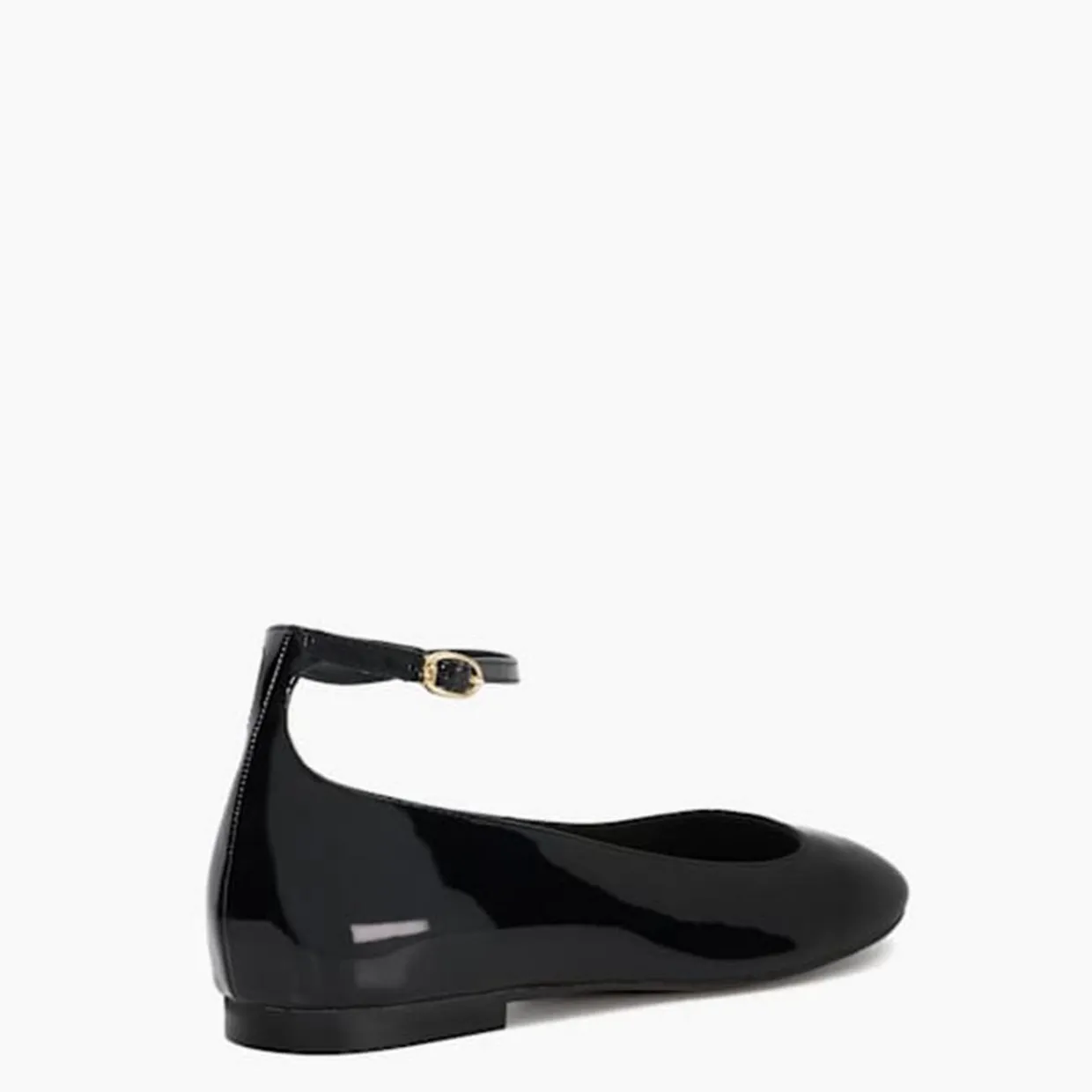- Patent ballet profile with adjustable ankle strap, gold hardware buckle with double D logo, low heel, round toe silhouette