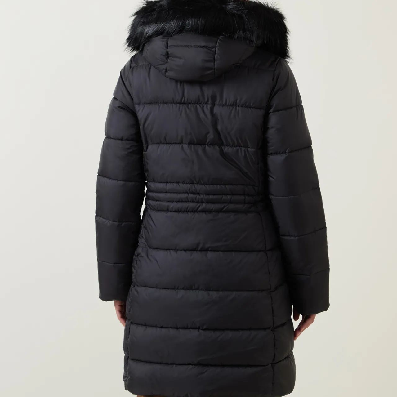 - Padded, quilted, longer length, zip fastening, faux fur hood, elasticated waist with toggle fastenings, two slip pockets, rubber logo patch