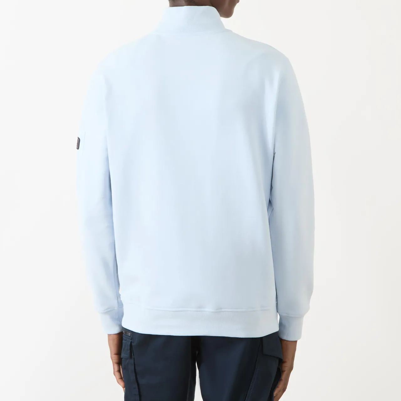 - Half-zip fastening, funnel neck, tonal logo patch to sleeve, pull-on, ribbed cuffs and hem, zip patch pocket to sleeve, two front slip pockets