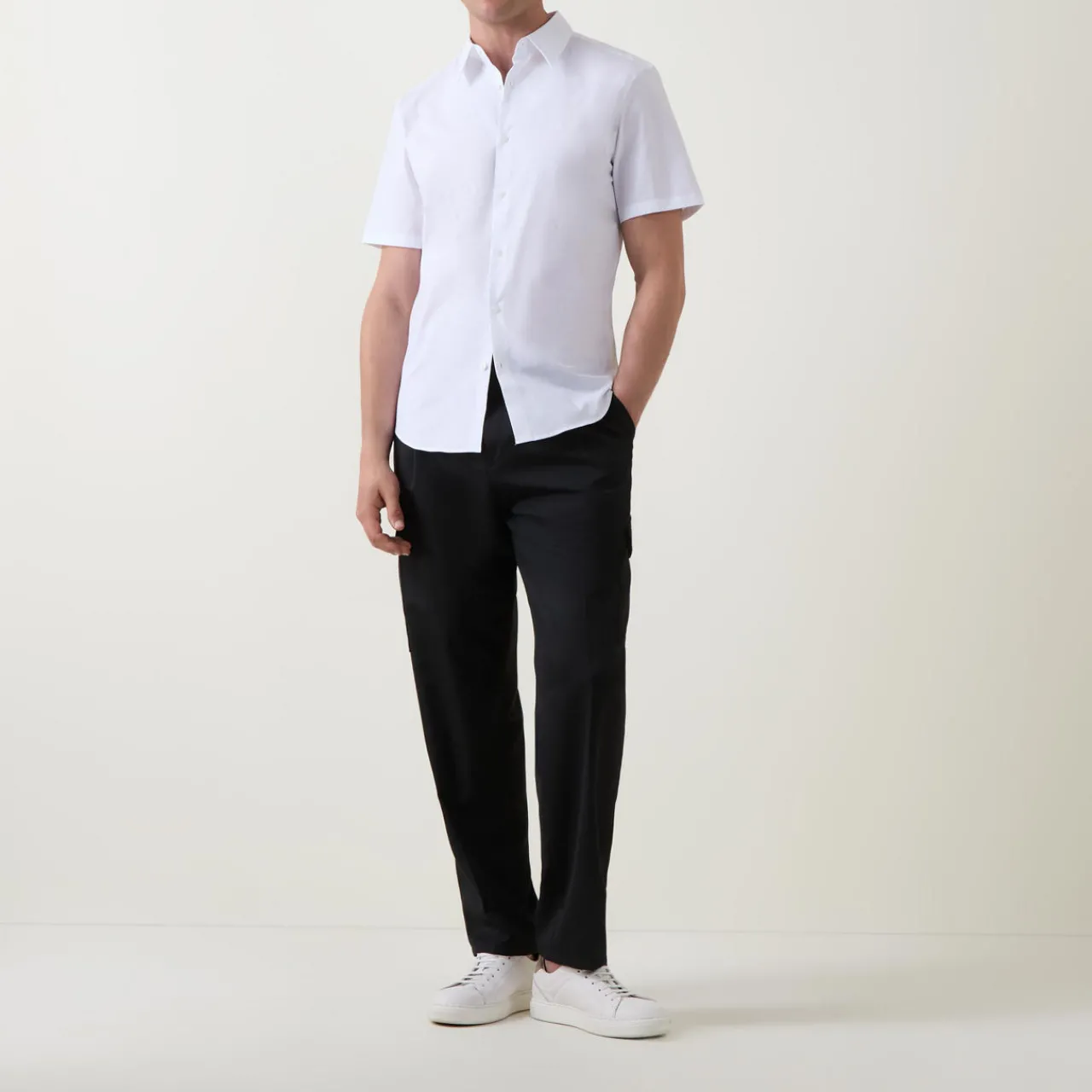 - Short sleeves, pointed collar, button fastening, tonal stitching, curved hemline, smooth fabric