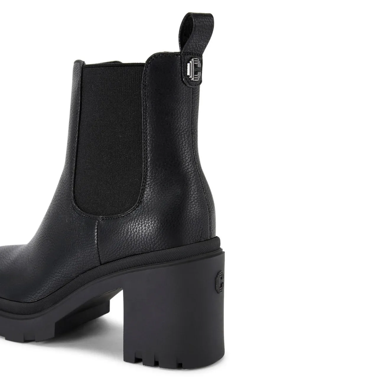 - Elasticated side panels, slip-on style, gunmetal Icon C heel stud, heel pull tab, round toe, block heel