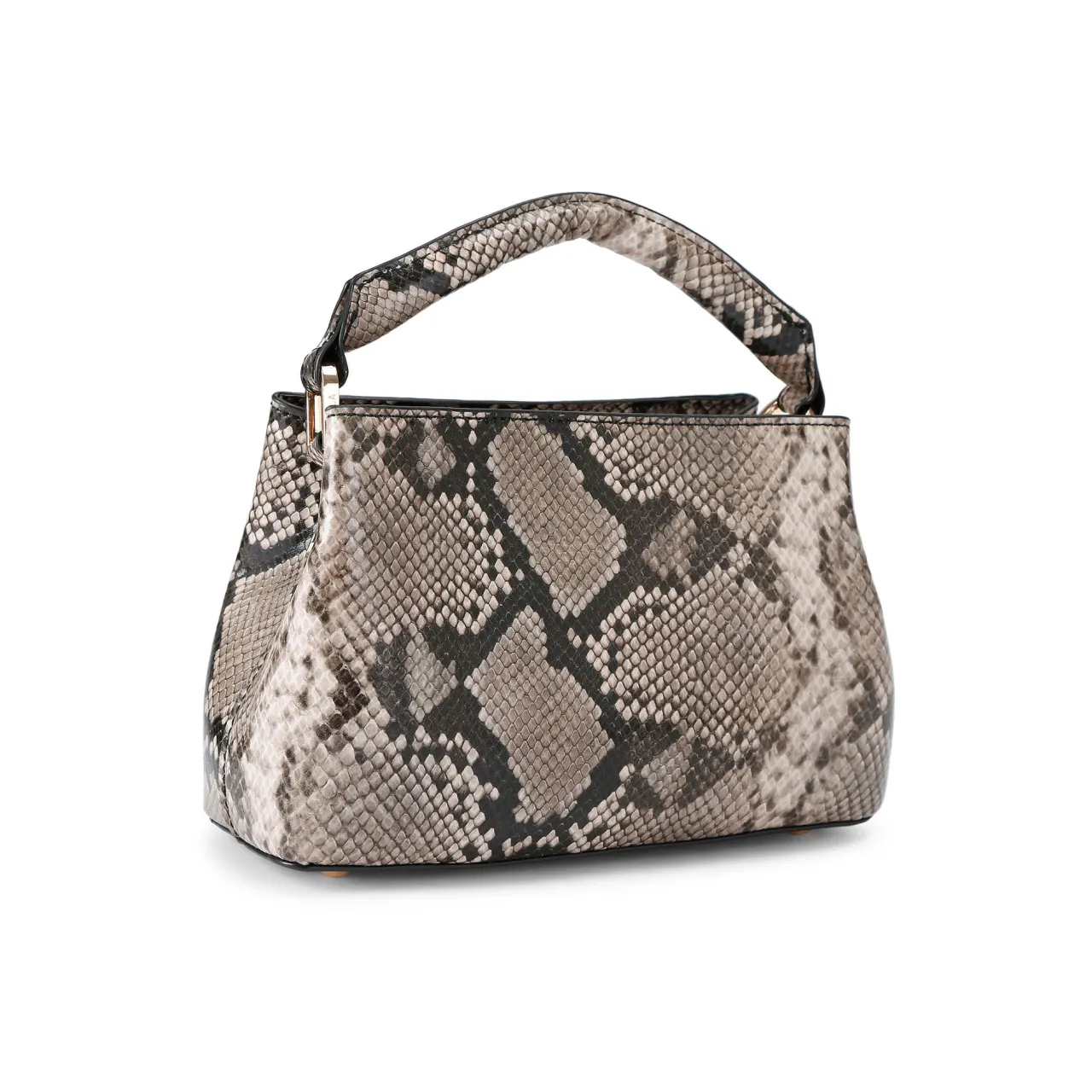 - Mini tote silhouette, snake-printed leather alternative, top handle, gold branding