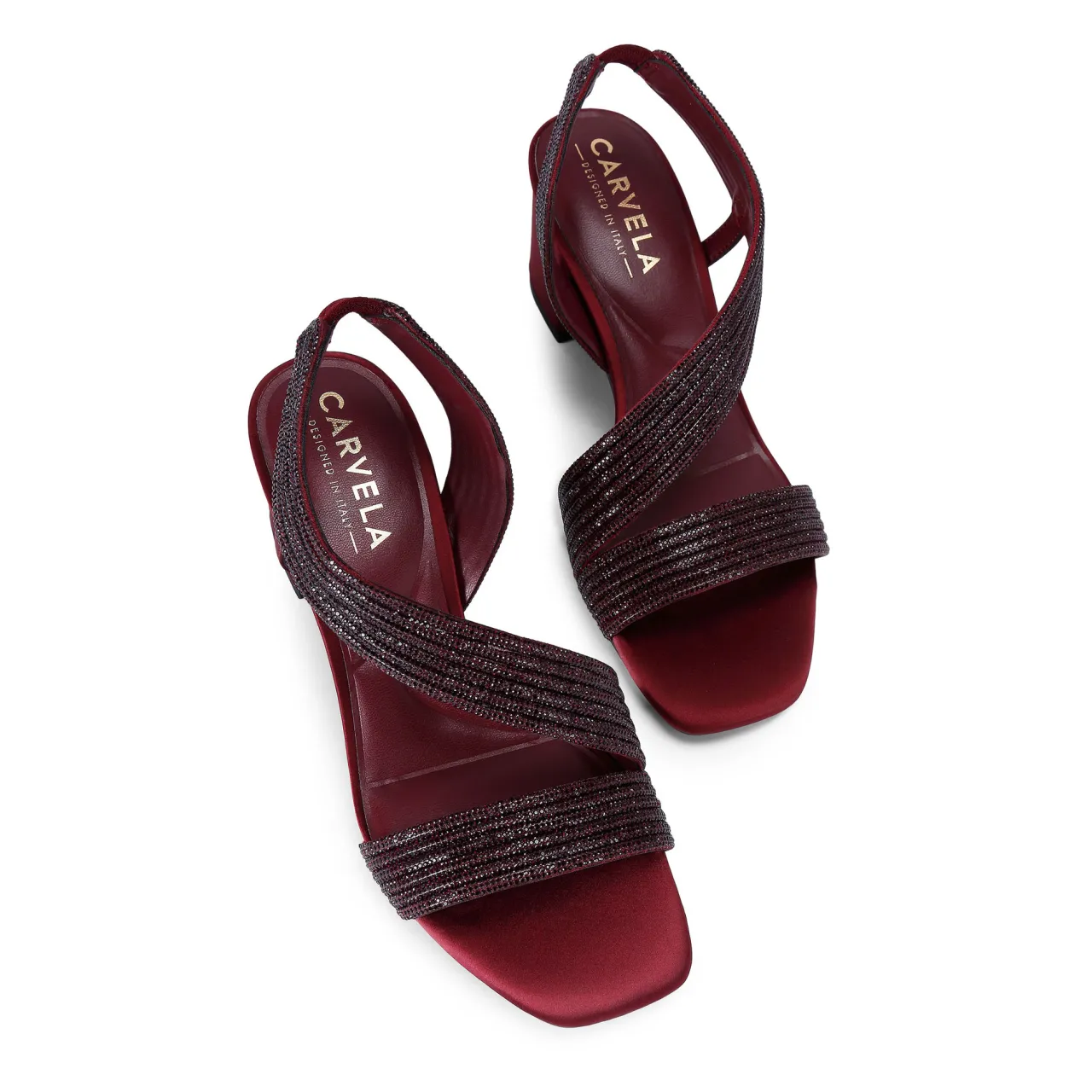 - Block heels, sandal style, crystal embellishment, slingback style, ‘All Day Long’ technology