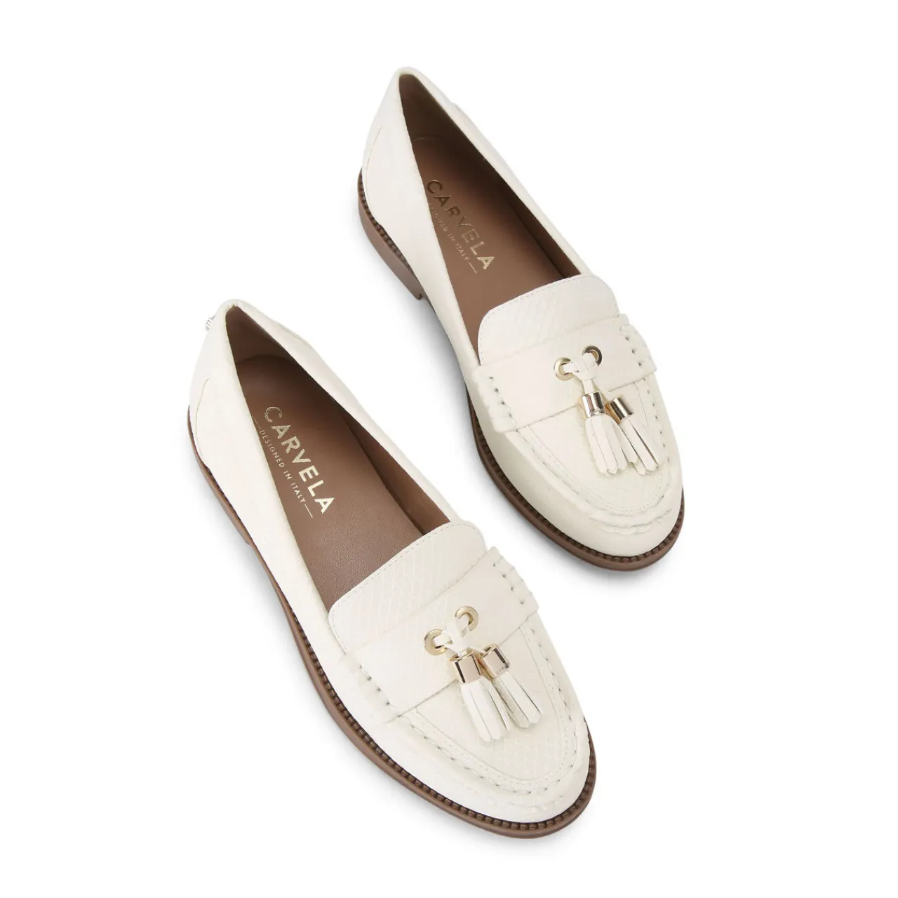- Slip-on style, lizard embossed design, tassel detail, gold-tone Icon C stud on the back of the heel
