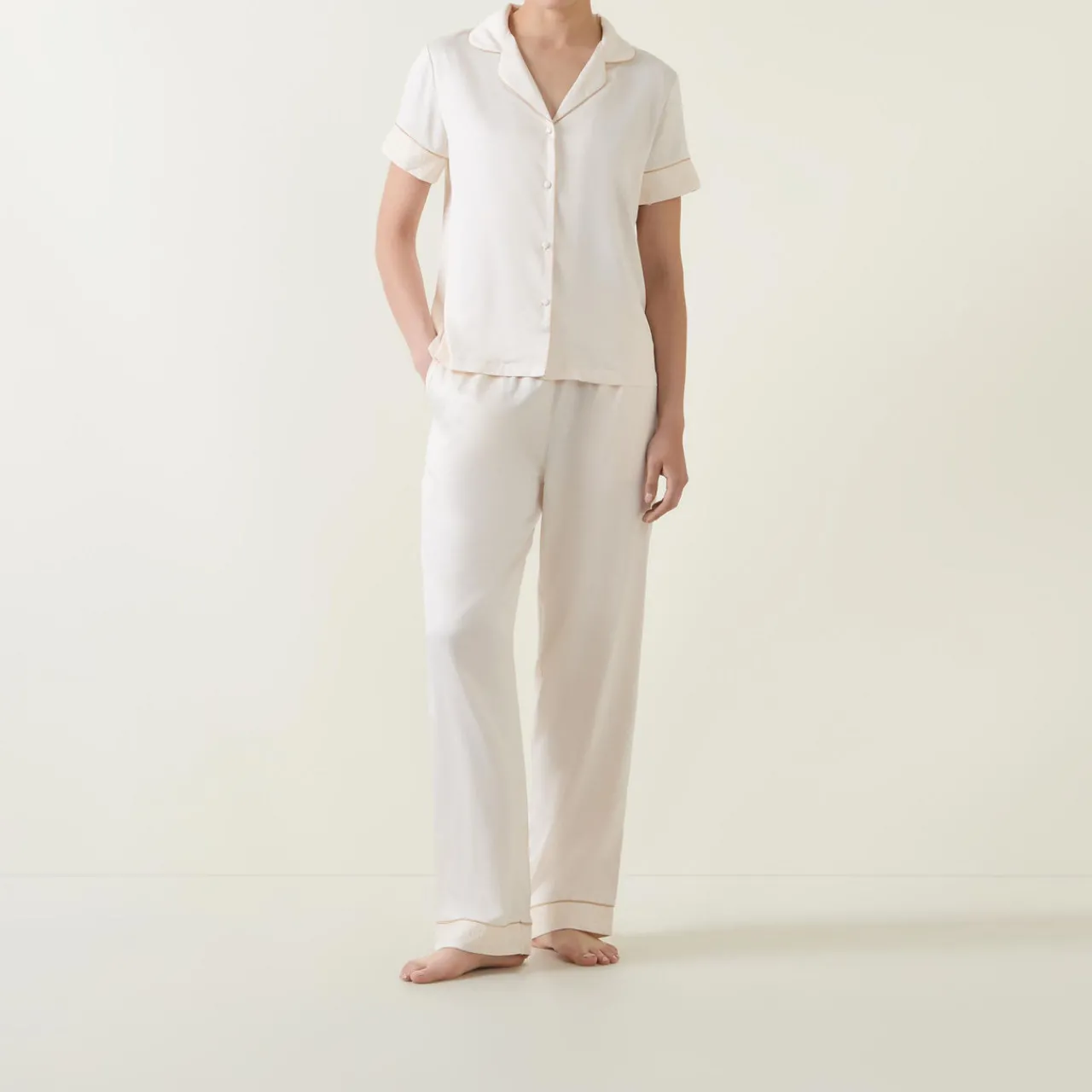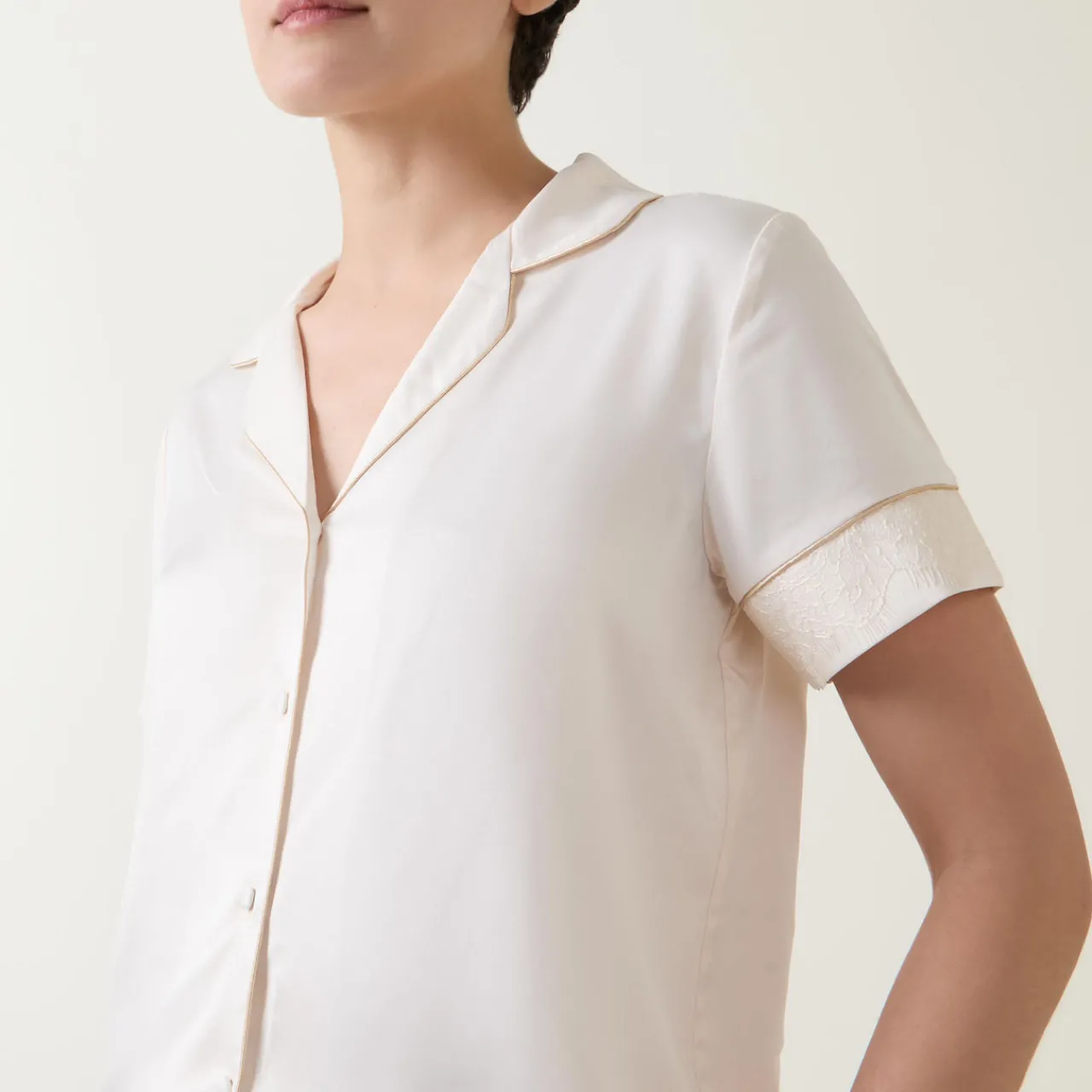 - Two-piece: Top: Rounded revere collar, short sleeves, tonal lace trim detailing, contrast piping, front button fastening, straight hem, satin finish; Bottoms: Mid-rise, straight leg, elasticated waistband with ribbon fastening, two side entry pockets, tonal lace trim detailing, contrast piping, clean hems, satin finish