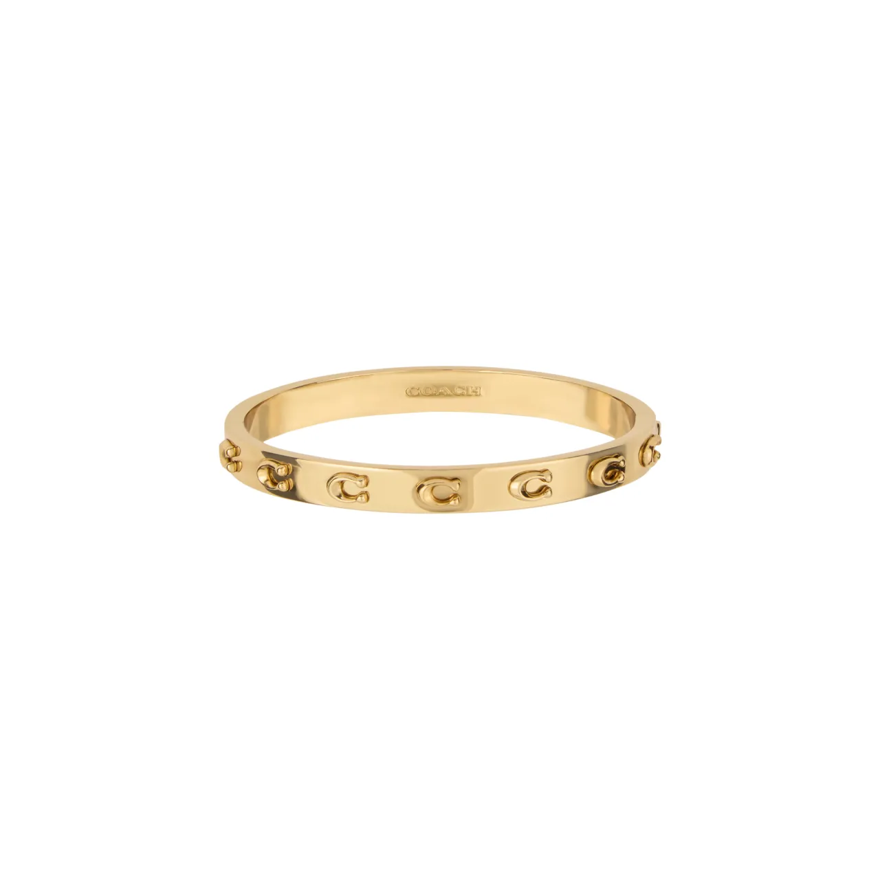 - Hinge fastening clasp, engraved logo branding, signature C logo emblem, bangle style, polished gold-tone finish