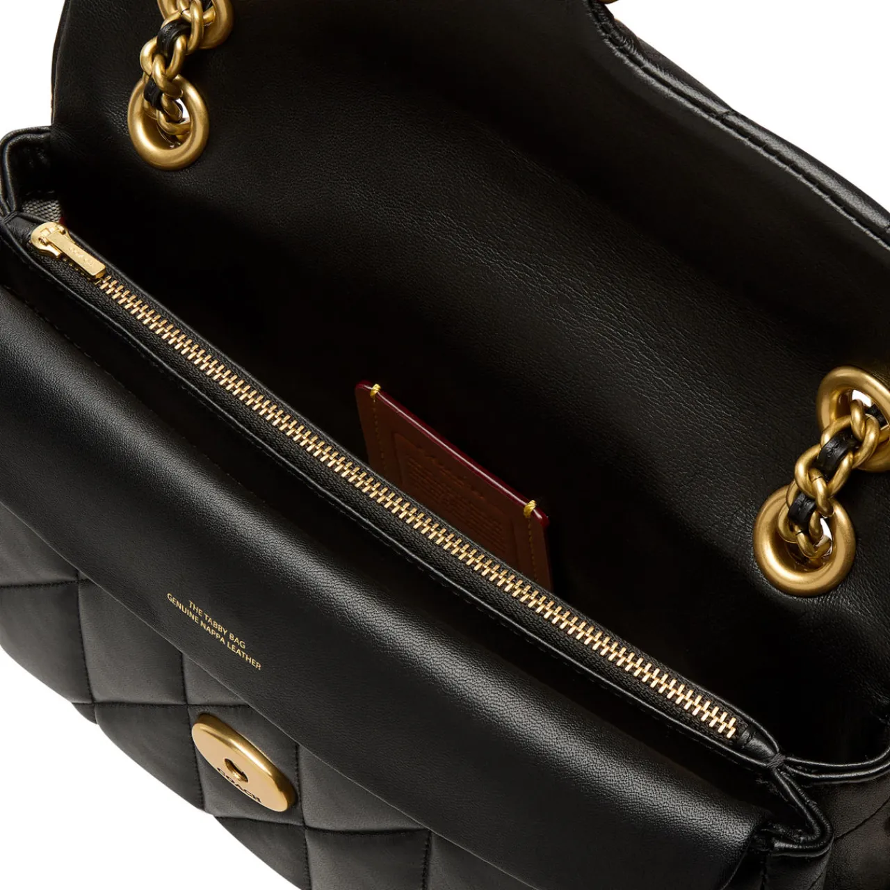- Braided shoulder strap, quilted, flap closure, logo detail, hanging charm, rear slip pocket, metal hardware, interior zipped pocket