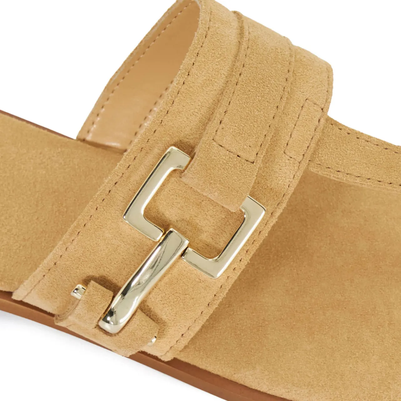 - Suede, toe post design, front strap, metal hardware, low stacked heel
