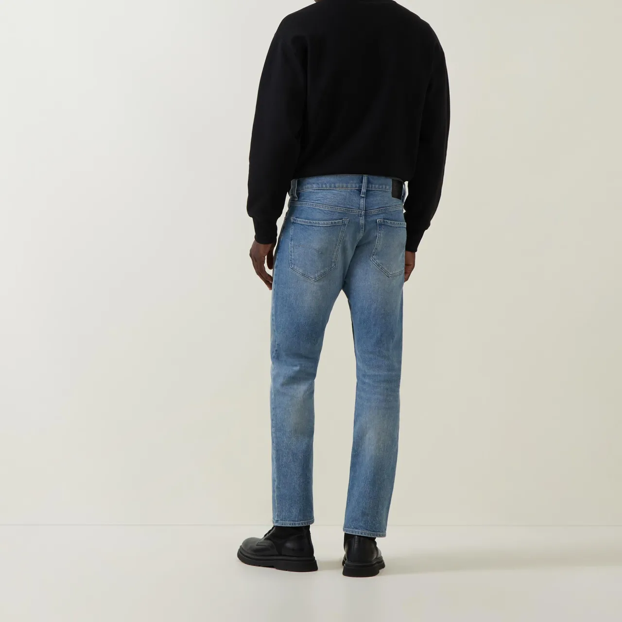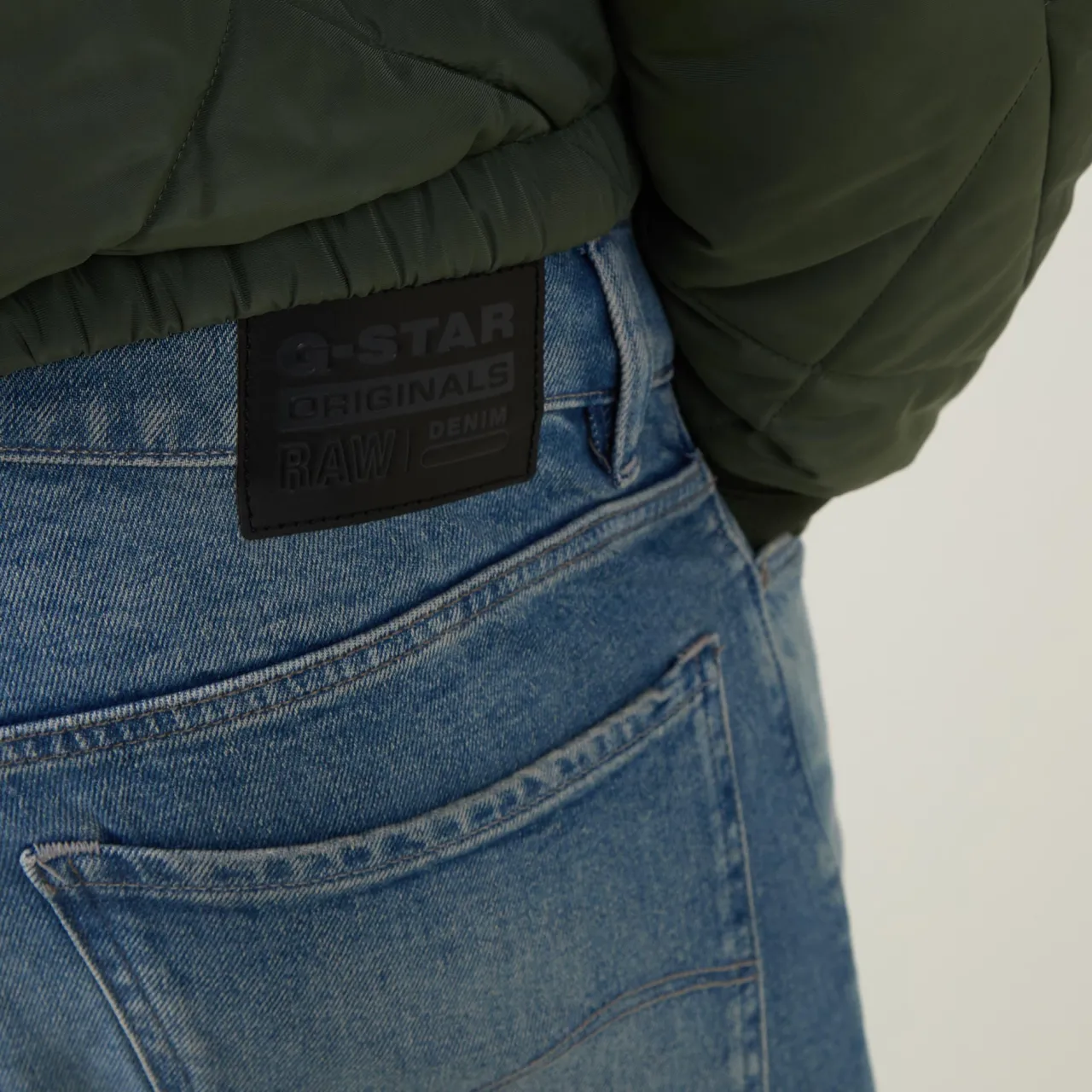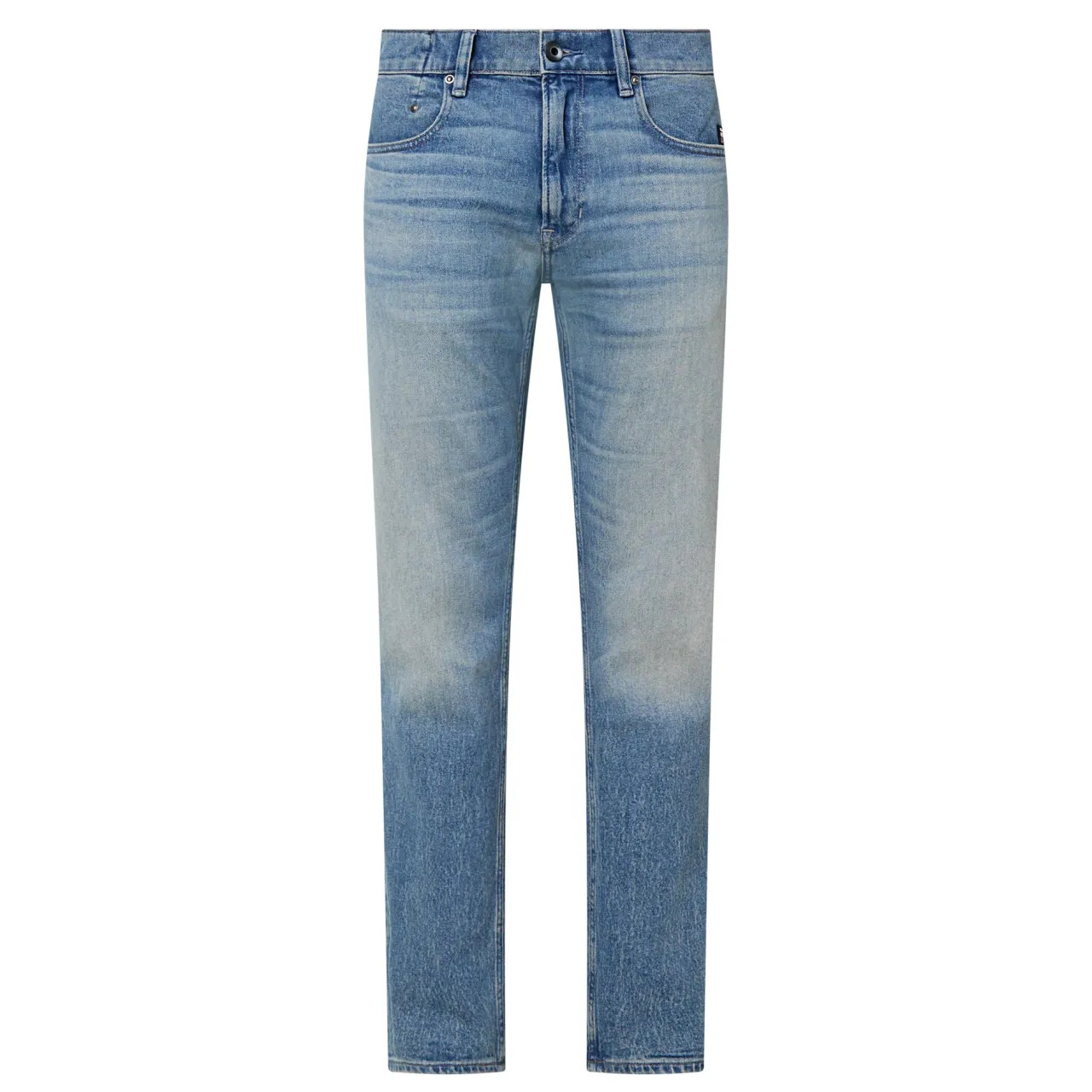 - Button and fly zipper fastening, belt loops, five-pocket style, whiskering and faded details, logo badge at back
