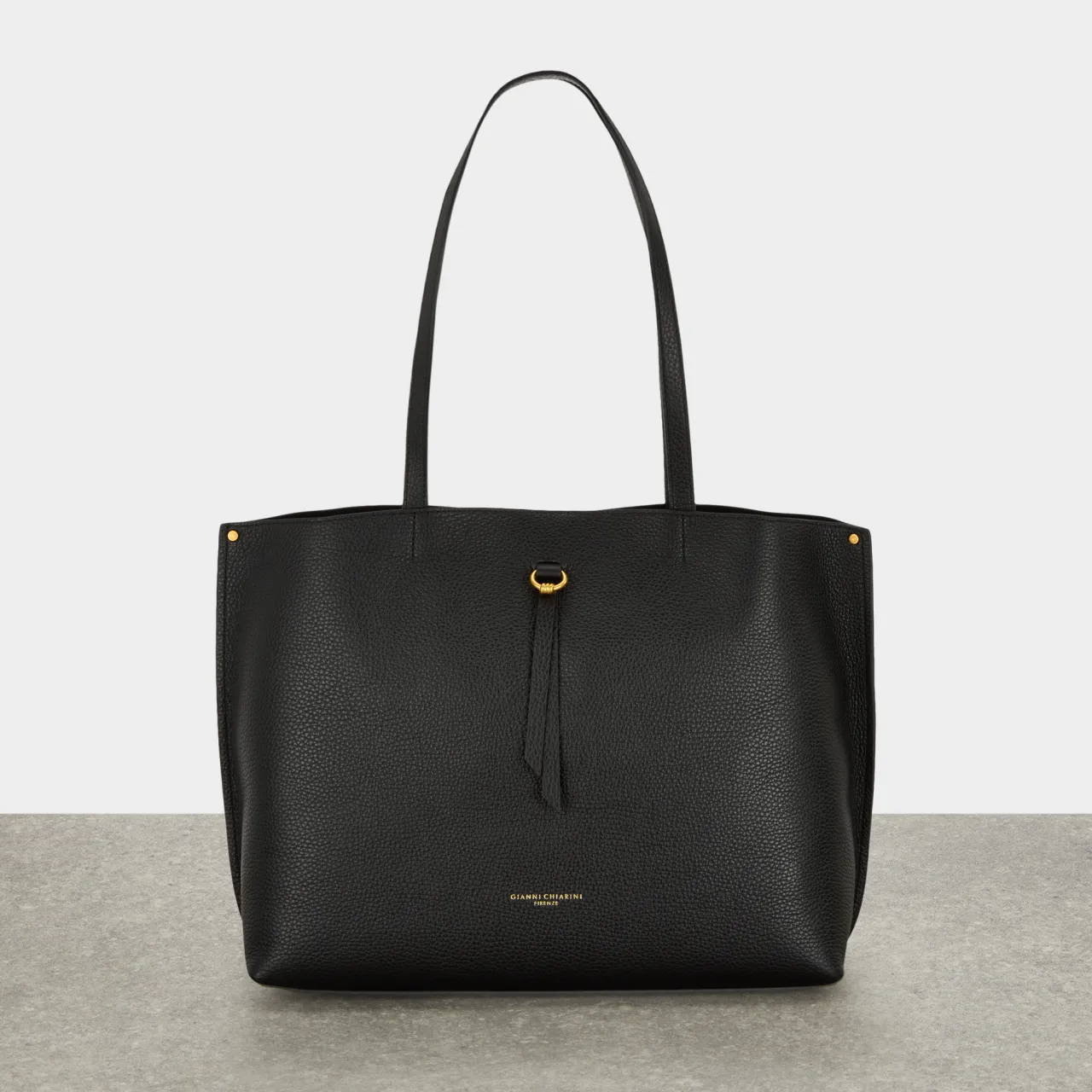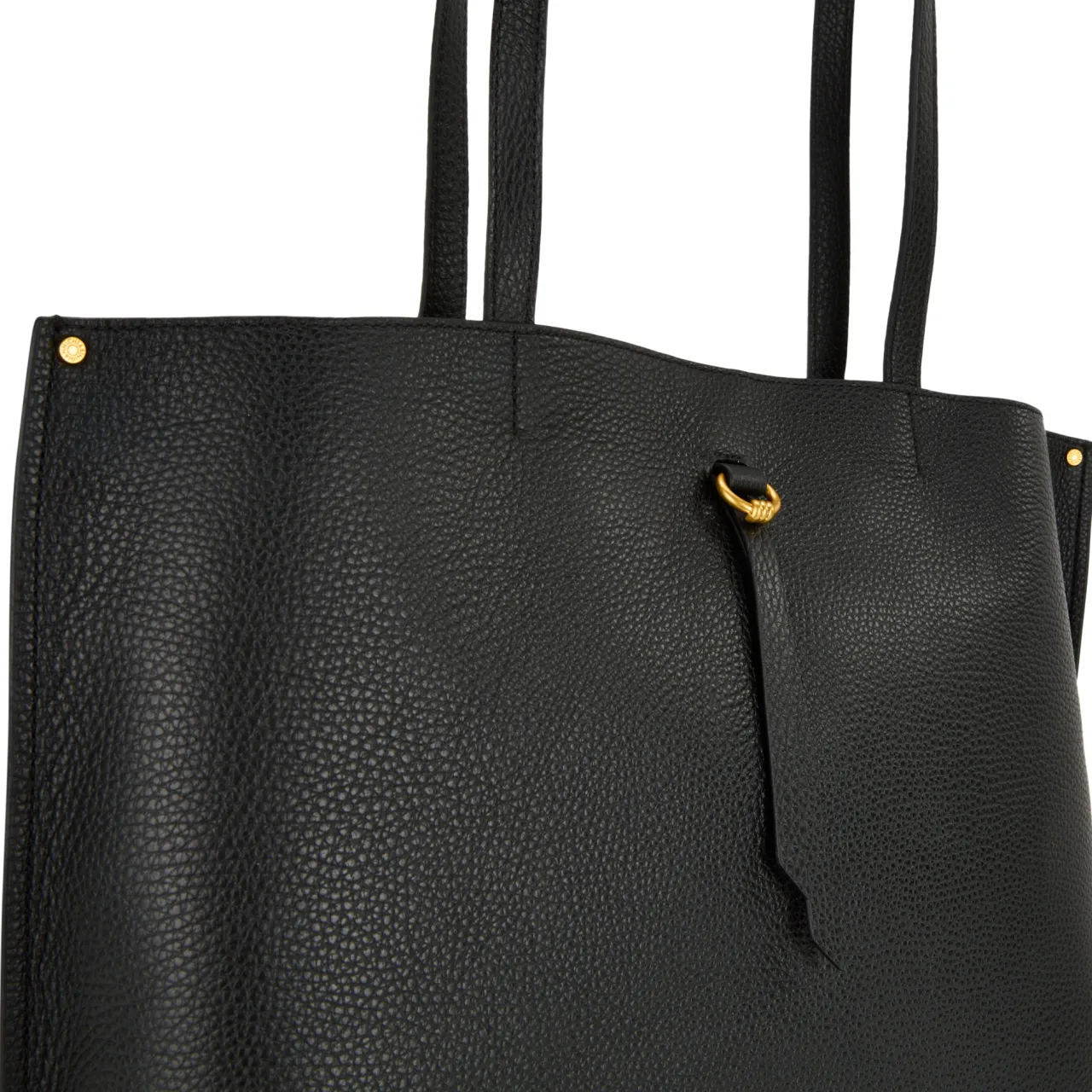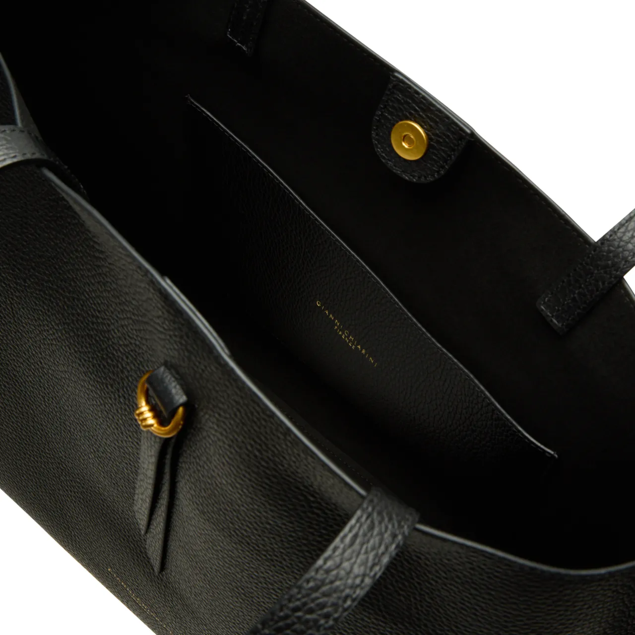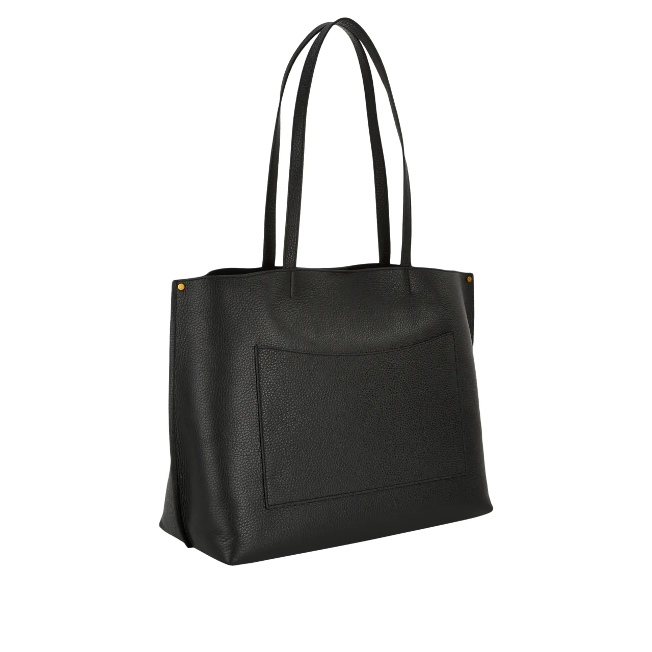 - Top handles, open top, logo detail, magnetic closure, gold-toned hardware, internal slip pocket, back slip pocket