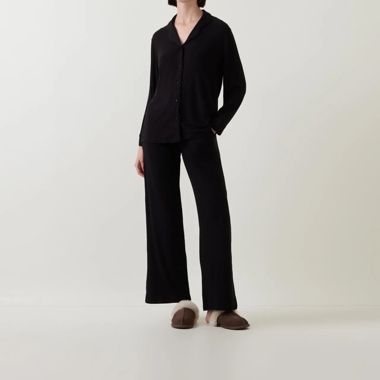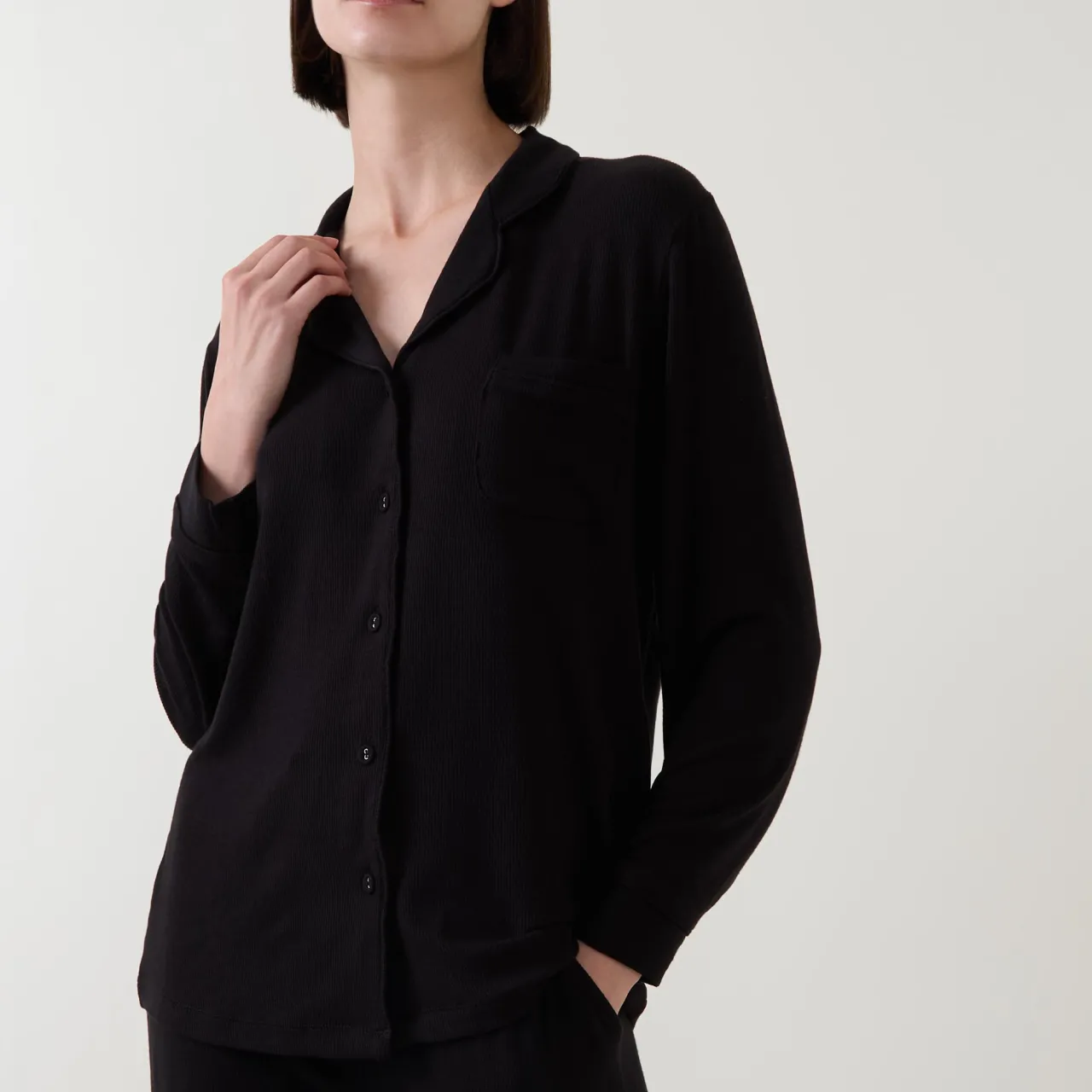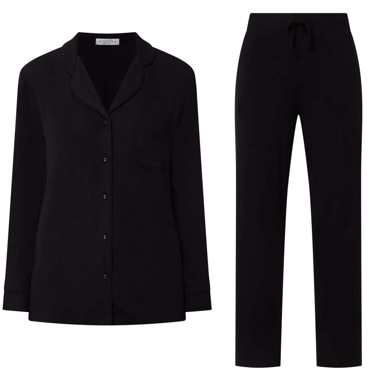 - Two-piece: Top: Notch lapel collar, long sleeves, one chest patch pocket, front button fastening, straight hem, ribbed design, soft finish; Bottoms: Mid-rise, straight leg, elasticated waistband, adjustable drawstring fastening, two side entry pockets, clean hems, ribbed design, soft finish