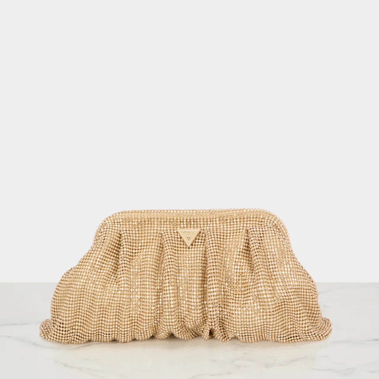 - Chain strap, hinge clasp fastening, signature triangle logo plaque to the front, slouchy shape, rhinestone mesh outer