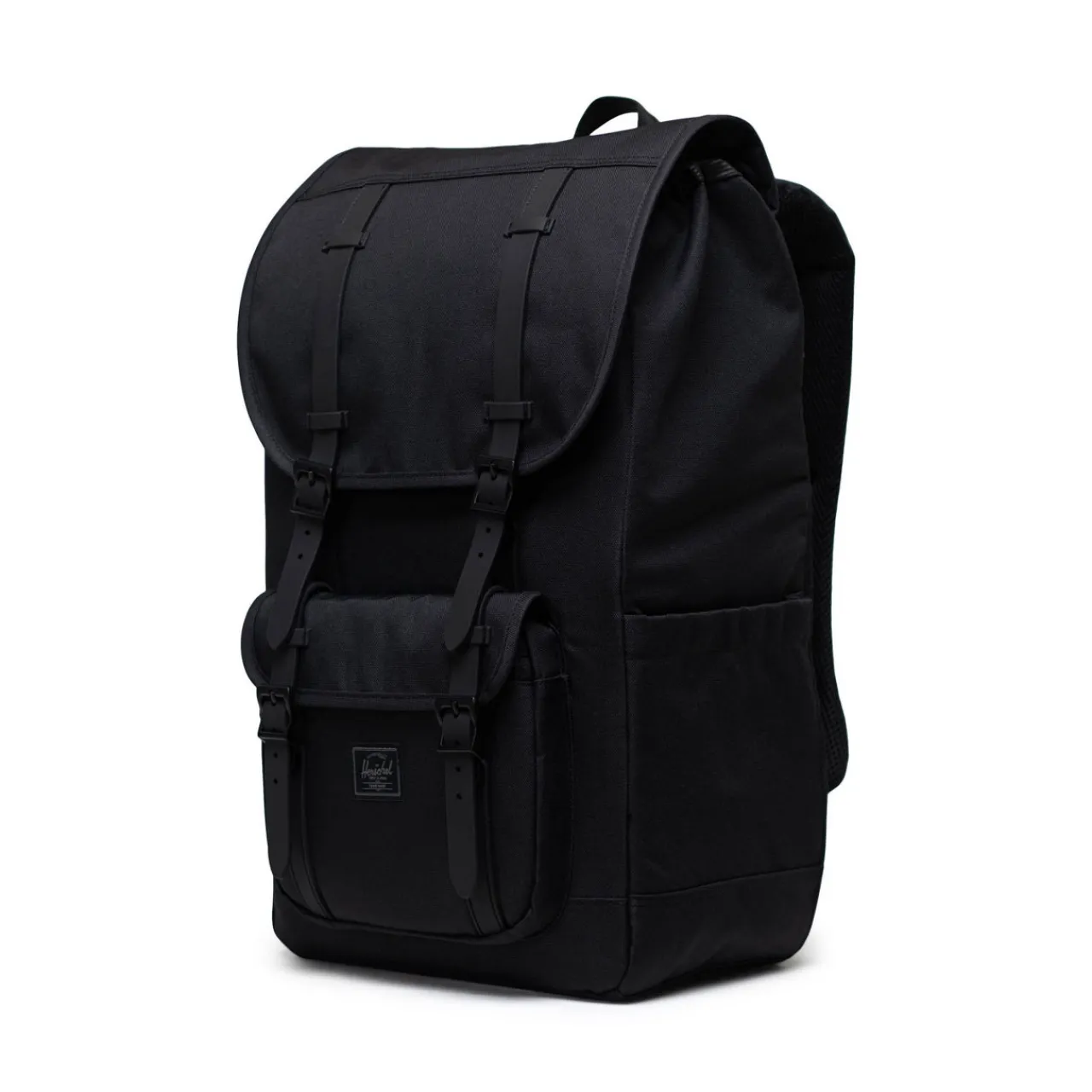 - EcoSystem™ 600D fabric, tonal stripe EcoSystem™ Liner, added and fleece lined floating sleeve, fits 15/16-inch laptops, easy U-pull drawcord closure, adjustable EVA-padded shoulder straps, sternum strap compatible, fold-over flap, magnet fastening straps with metal pin buckles, carry loop, back entry zipper, dual water bottle pockets, top lid pocket with key clip, zipped front pocket, Put Yourself Out There™ internal label, internal Herschel Supply stripe DNA tab, brand logo details