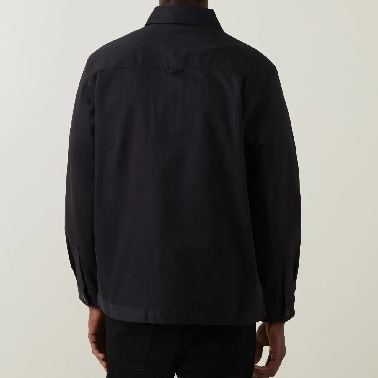 - Point collar, long sleeves, dropped shoulders, full zip-through fastening, two chest flap pockets, logo detail on chest, two side in-seam pockets, tonal stitching, straight hemline, smooth fabric