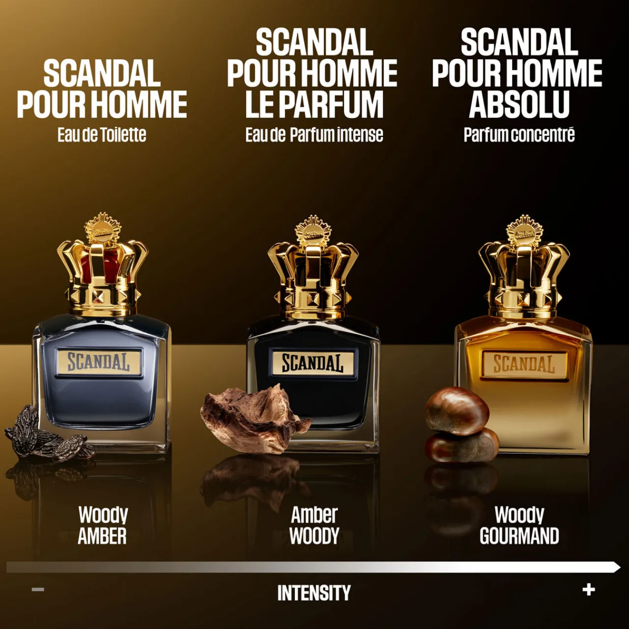 An absolute Scandal! Have you heard the word on the street? Scandal Pour Homme Absolu is Jean Paul Gaultier’s latest king of the night. Crowned with an outrageously sensual, free-spirited intensity, wild charisma floods the senses with gold-lacquered irreverence. An addictive, gourmand woody accord rises on the breeze, trailing through to sleepless nights. The scandal is only getting started.