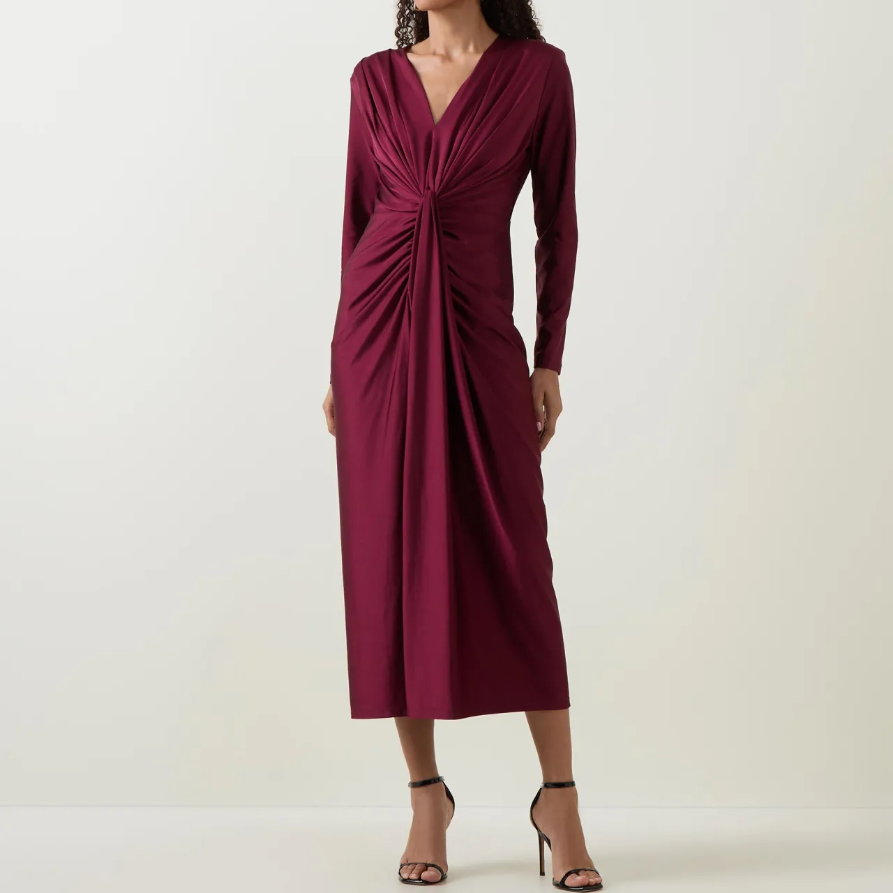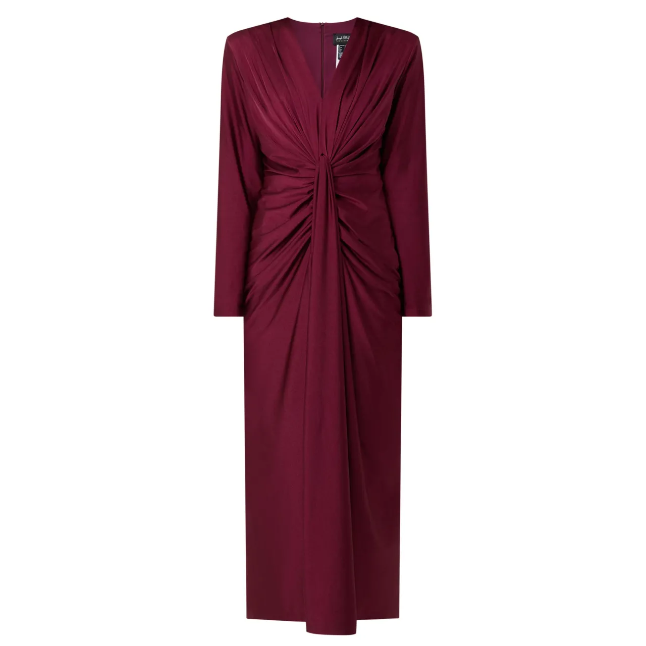 - Long sleeves, V-neckline, back zip-fastening closure, draped detail to the front, gathered waist, fitted silhouette, midi length