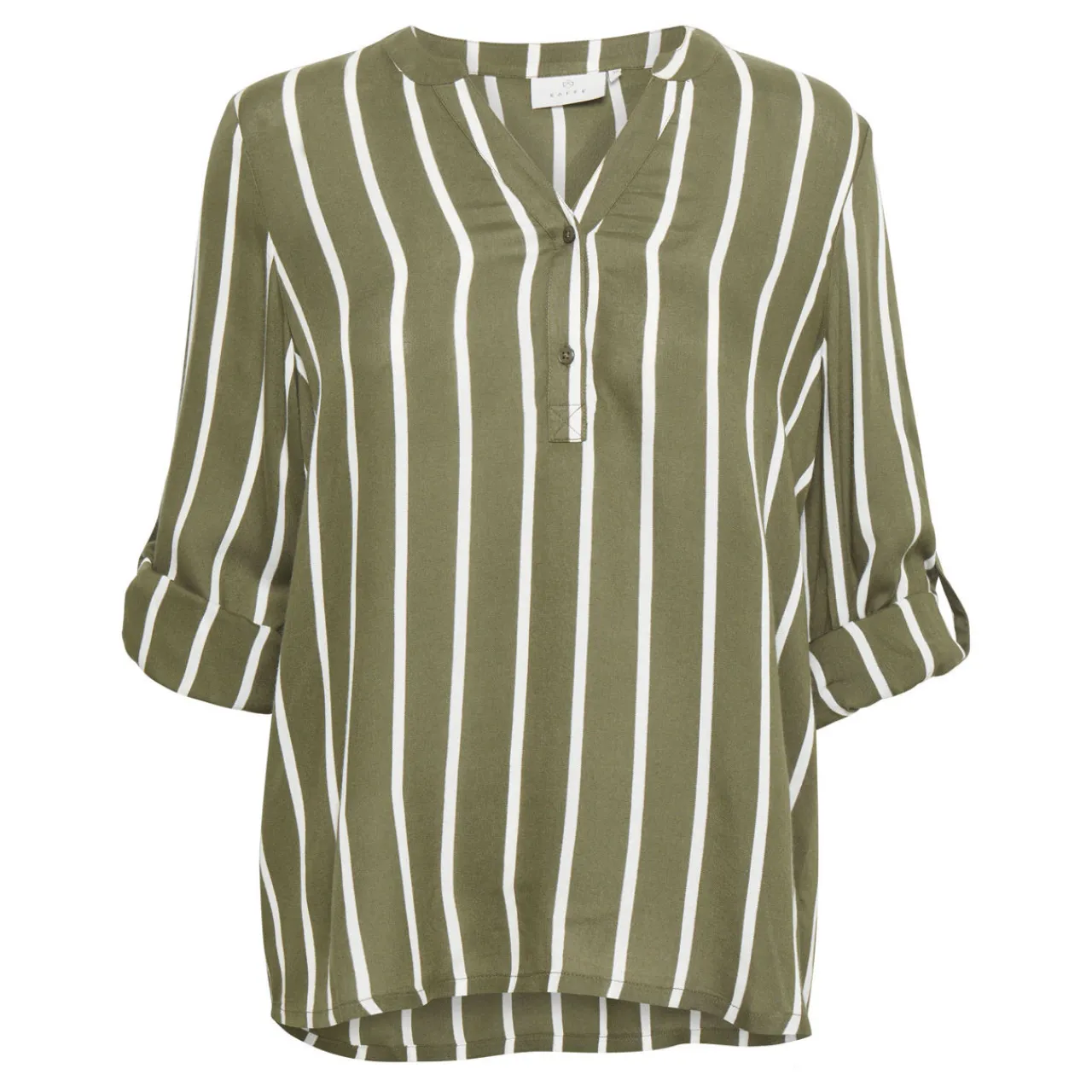 - Open V-neckline, button fastening, tab adjustable sleeves, striped pattern