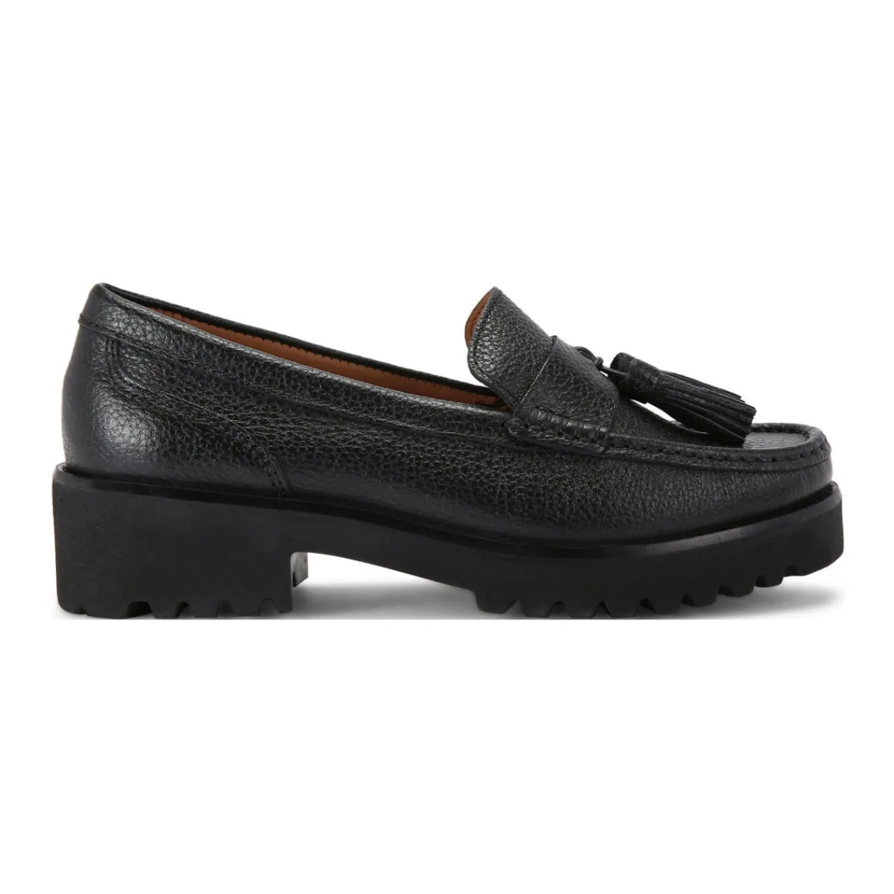 - Almond-shape toe, slip-on style, low vamp, block heel, tassel and strap detail, logo print on interior, grained finish