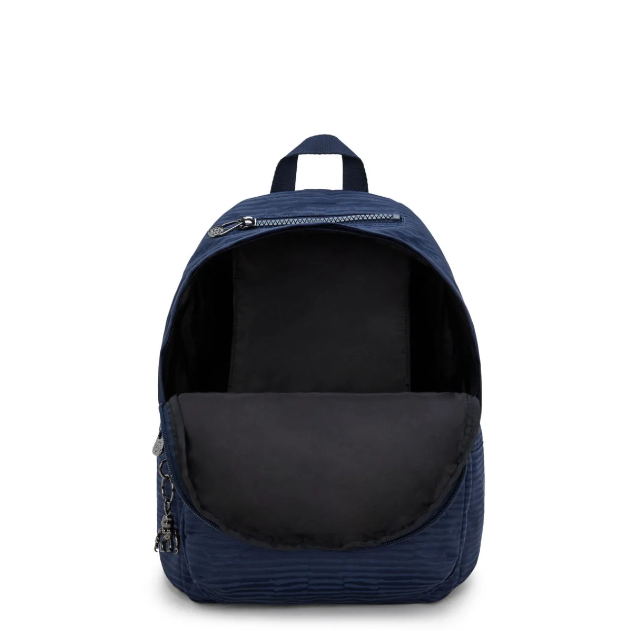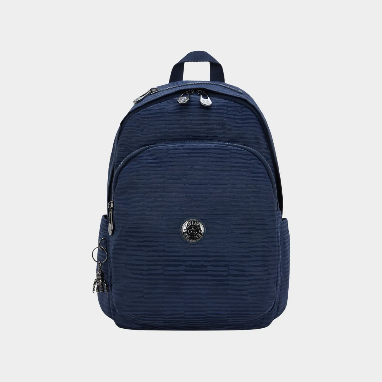 - Features: Exterior: Water repellent, two zipped front pockets, three functional compartments, two elasticated open side pockets, wide adjustable backpack straps, top handle, key fob, round brand logo, metal robot monkey keyring, lined. Interior: One zipped main compartment, one zipped pocket, one wallet compartment, two pen compartments