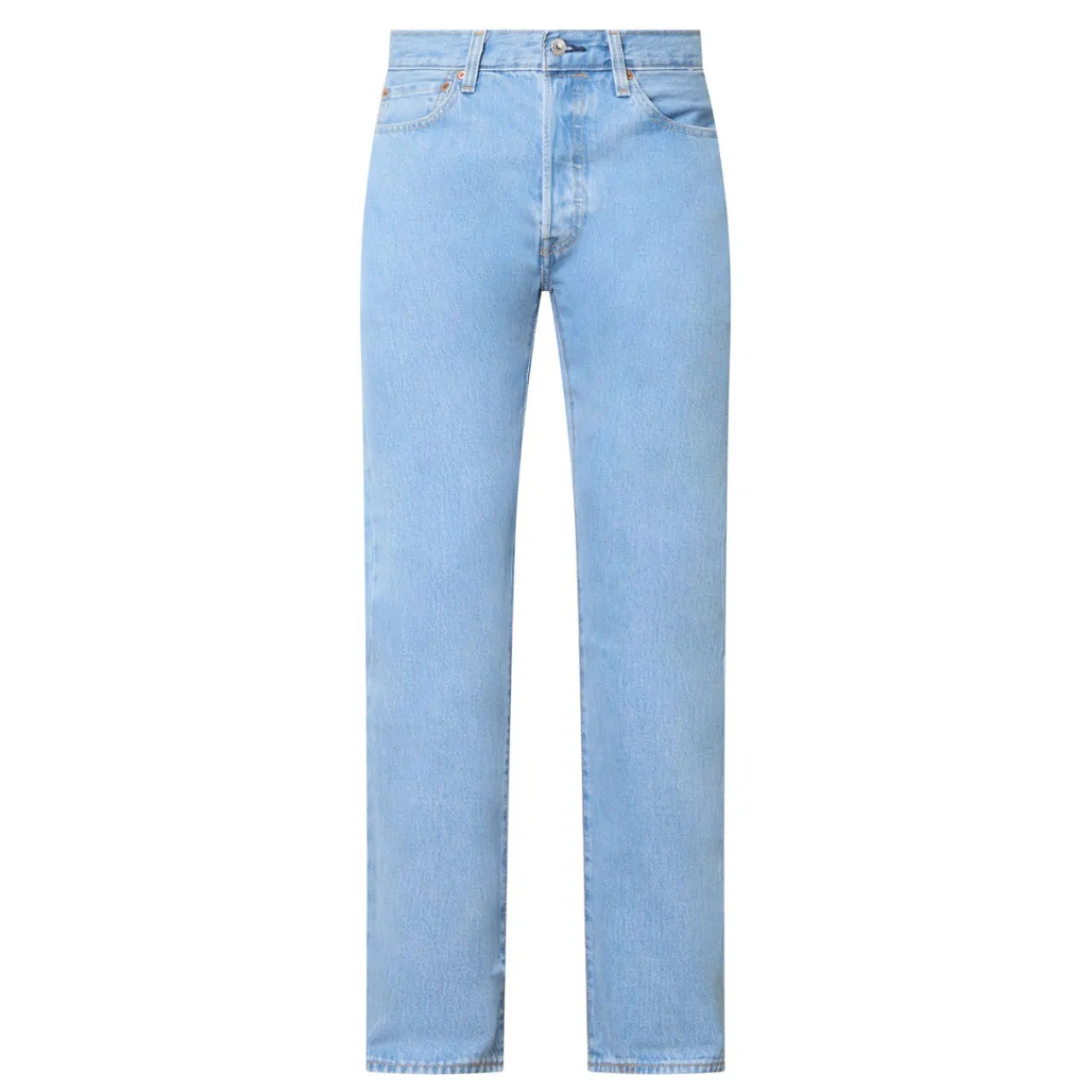 - Zip-fly and button fastening, belt loops, five-pocket design, contrast top stitching, rear logo patch, signature red logo tab, mid-rise, straight-cut leg, smooth denim finish