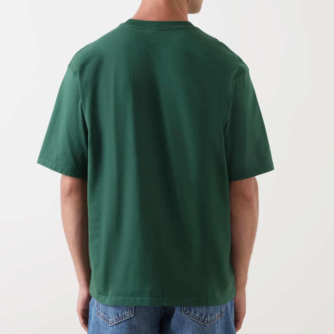 - Crew neckline, short sleeves, dropped shoulders, chest patch pocket with logo patch, tonal stitching, straight hemline, smooth fabric