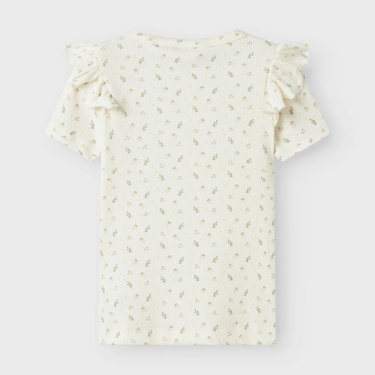 - Short sleeves, round neckline, frill shoulders, floral motif, straight hemline, ribbed fabric
