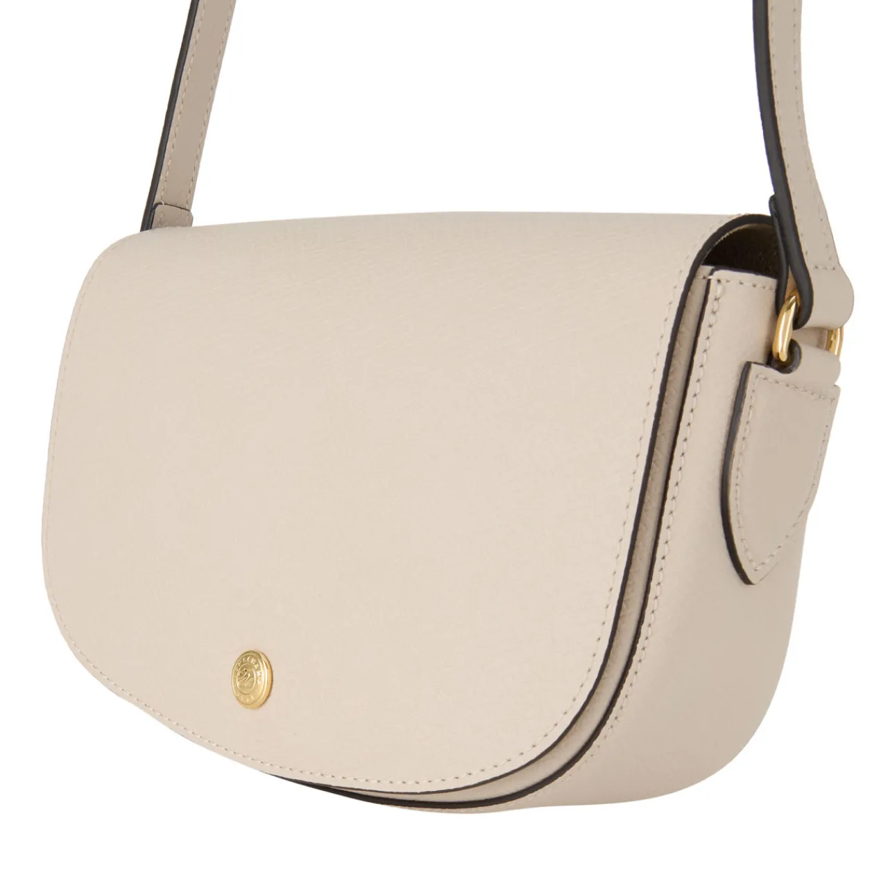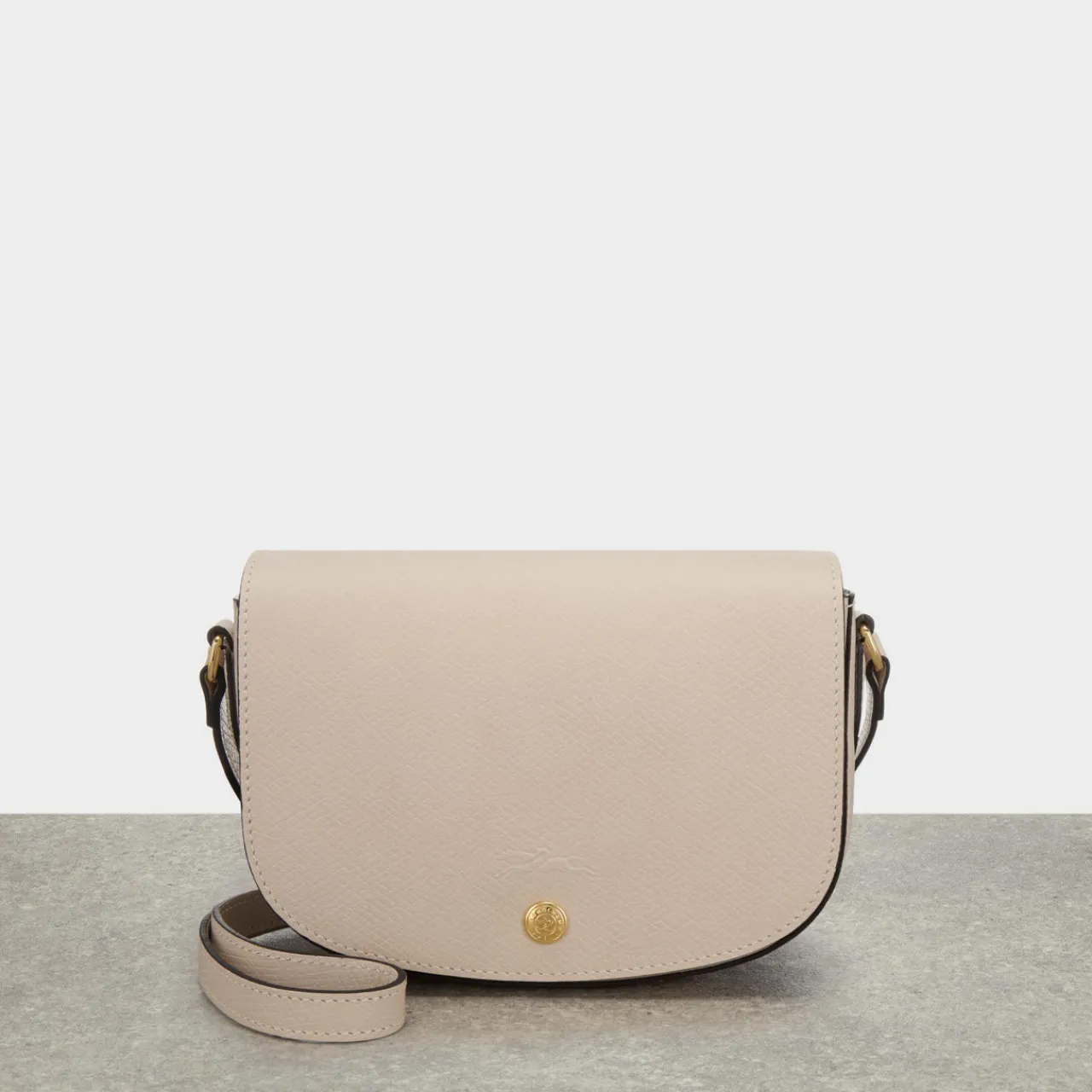 - Flap with snap button fastening, adjustable crossbody strap, contrast stitching, gold-tone hardware, logo detail, textured finish
