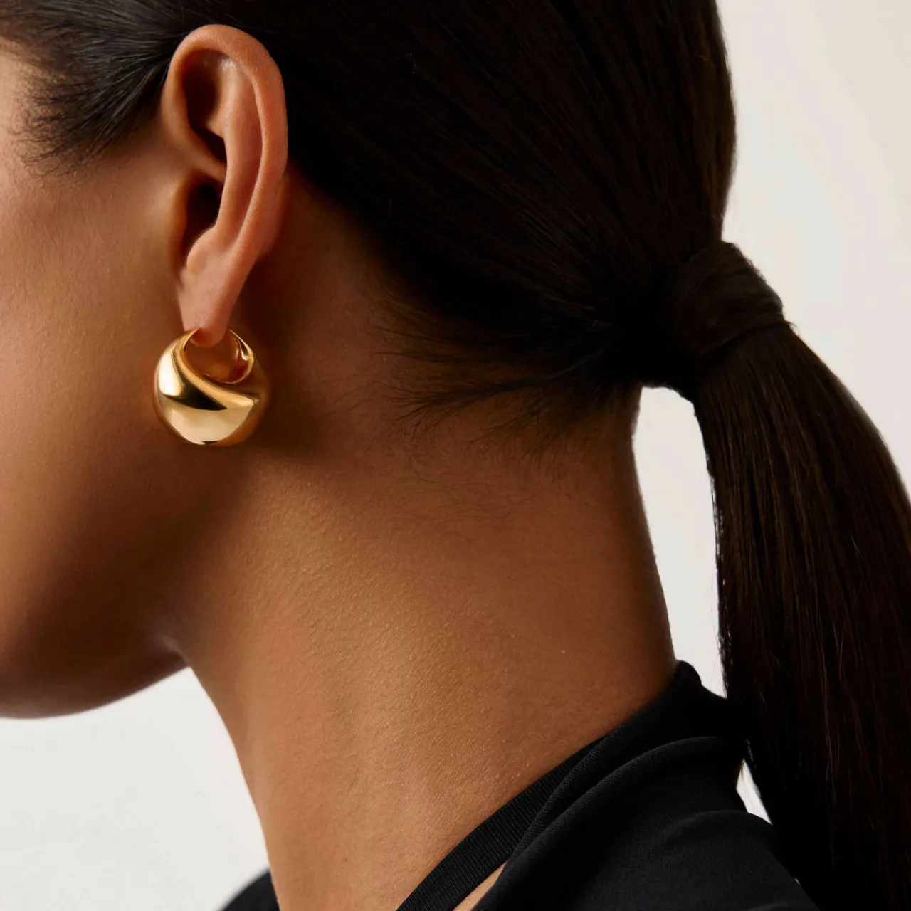 - Sculptural Air’ collection, inspired by sculptural shapes, lightweight, medium-sized chunky hoop style, molten-domed design, latch fastening