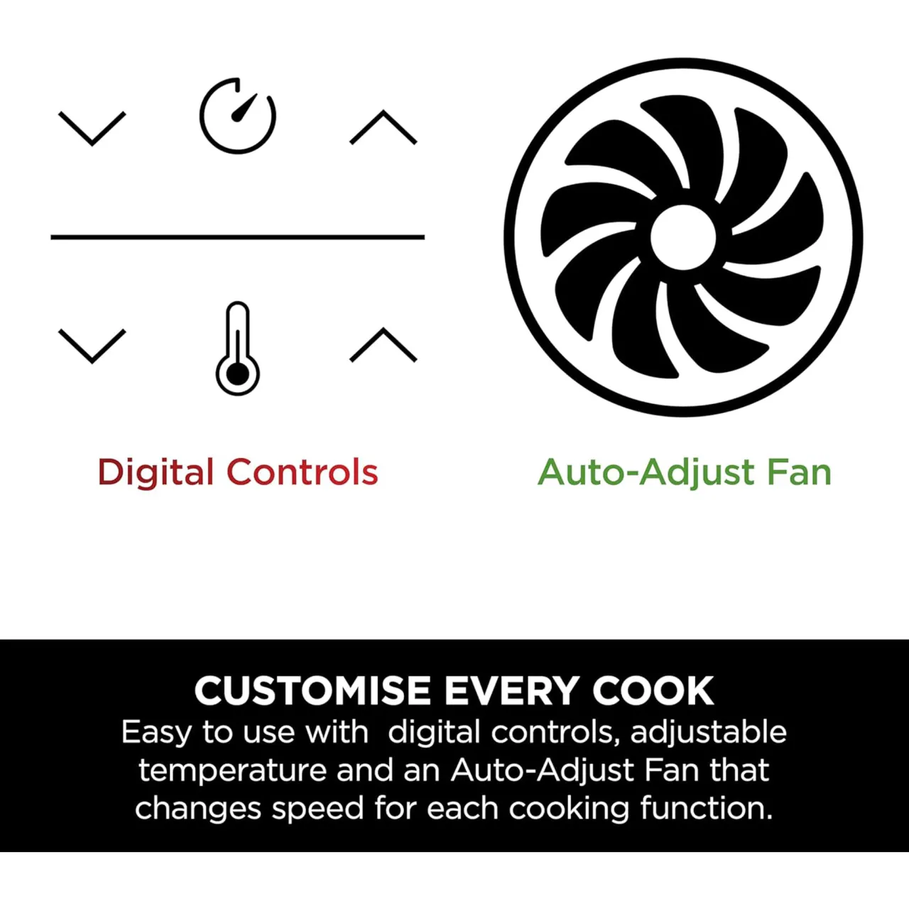 Easy to use:Customise every cook with a simple digital control panel, variable temperature controls, and a countdown timer to see how much cooking time is left. The Auto-Adjust Fan automatically changes speeds based on the cooking function selected.