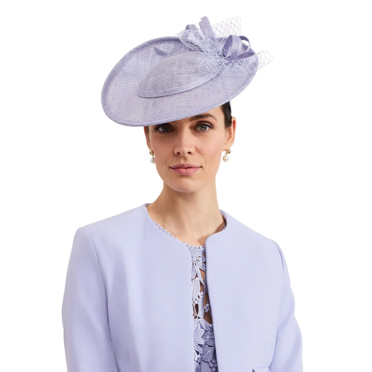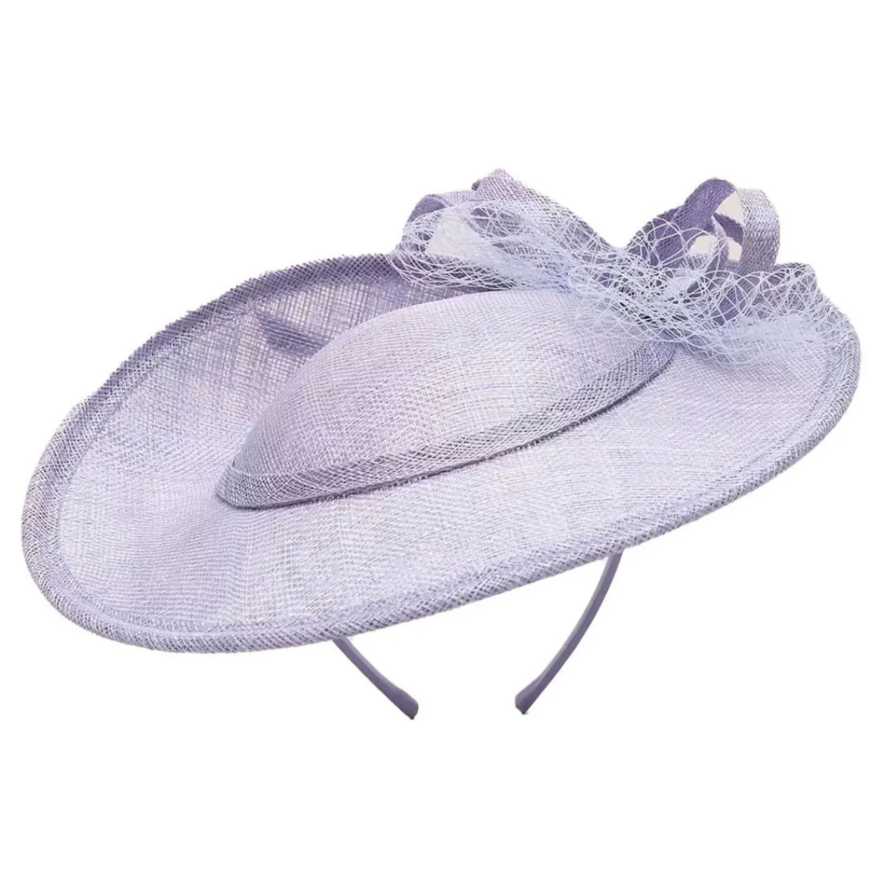 - Fascinator accessory, thin headband, offset disc, bow detail, netting, slip-on style