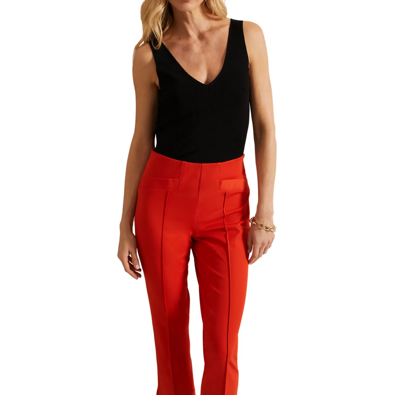 - Wide stretch waistband, front seams, front slit pockets, split hem
