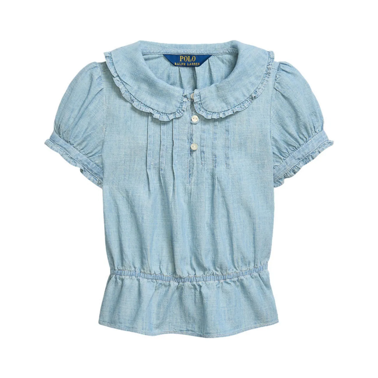 - Multi-coloured signature embroidered Pony at the right hem, Peter Pan collar with ruffle trim, three-button placket, puffed short sleeves, buttoned armbands with ruffle trim, pin tucks along the bodice, elasticised waist, peplum hem