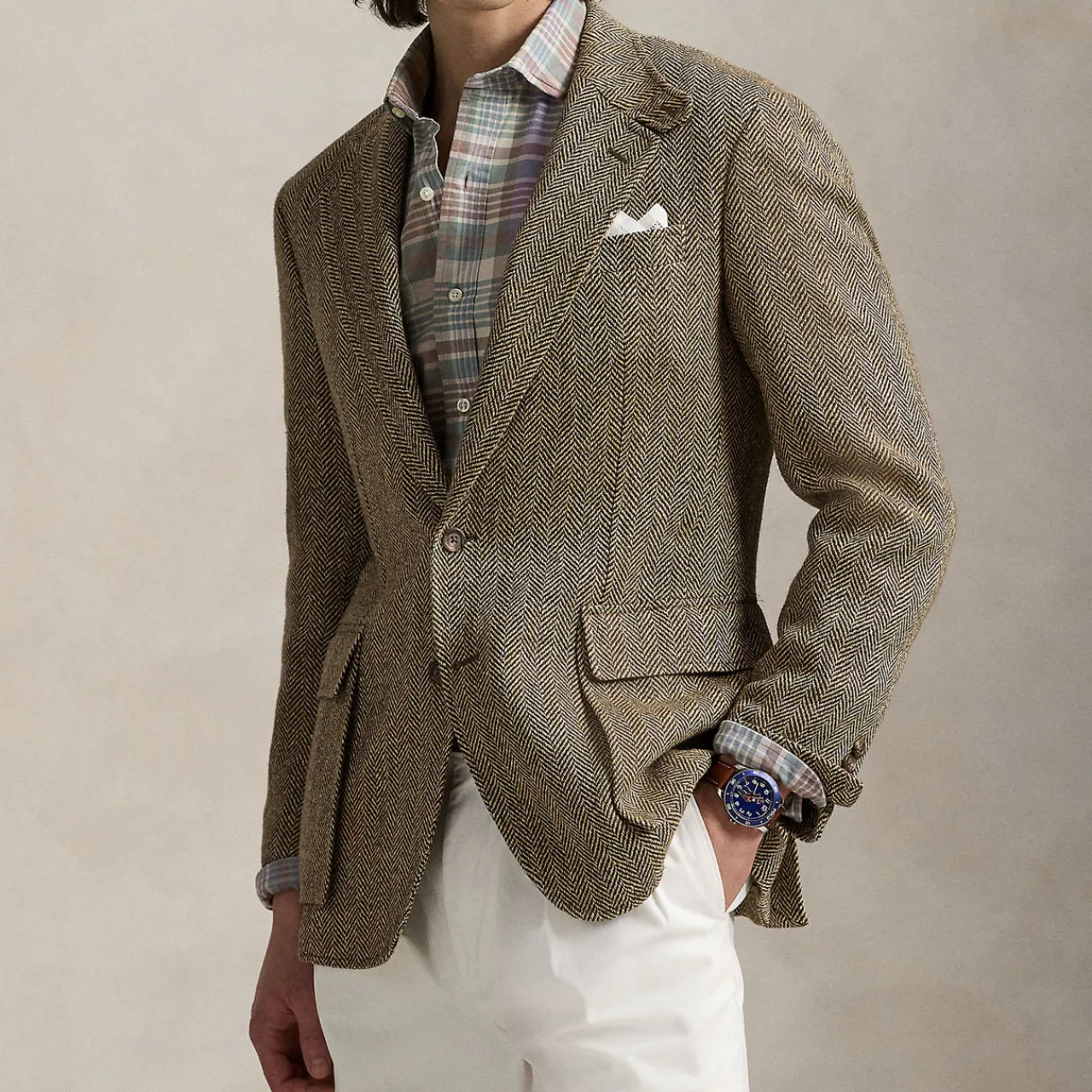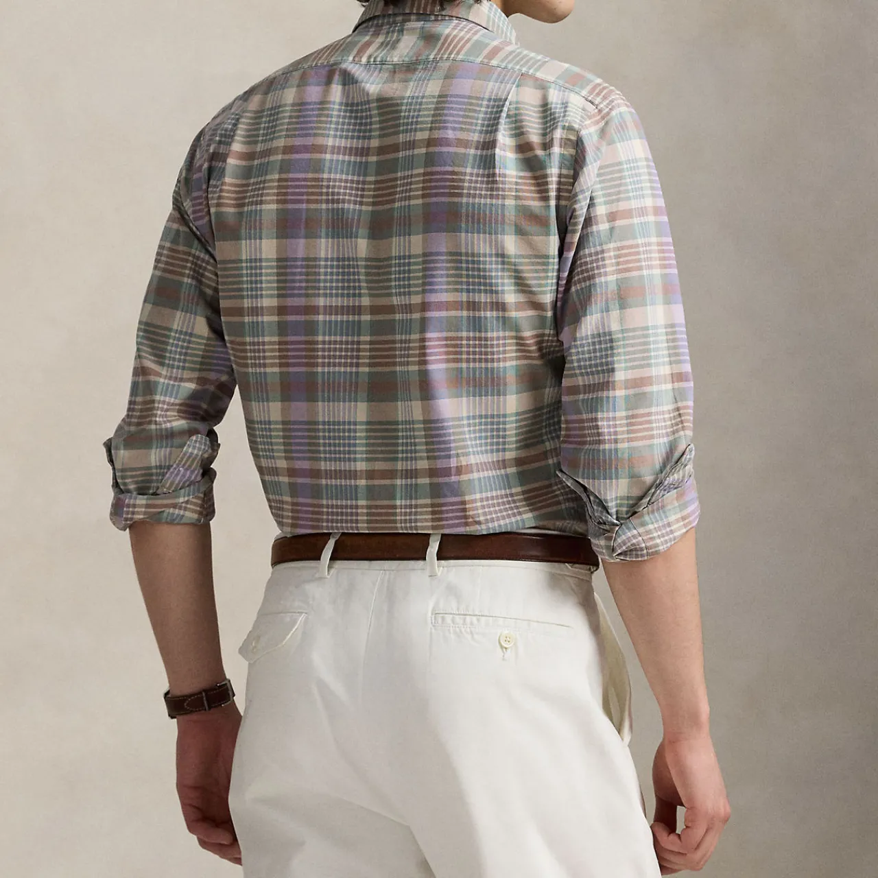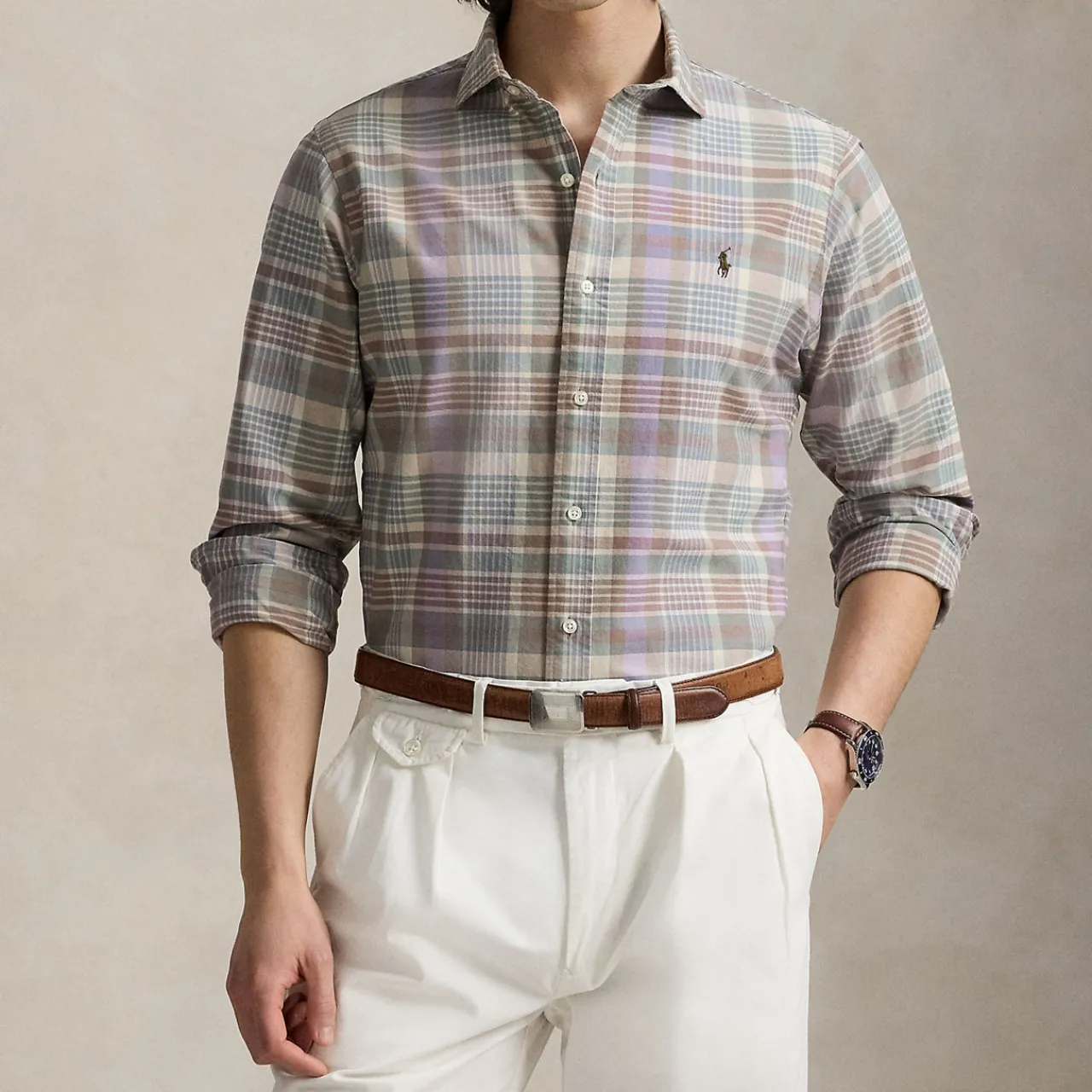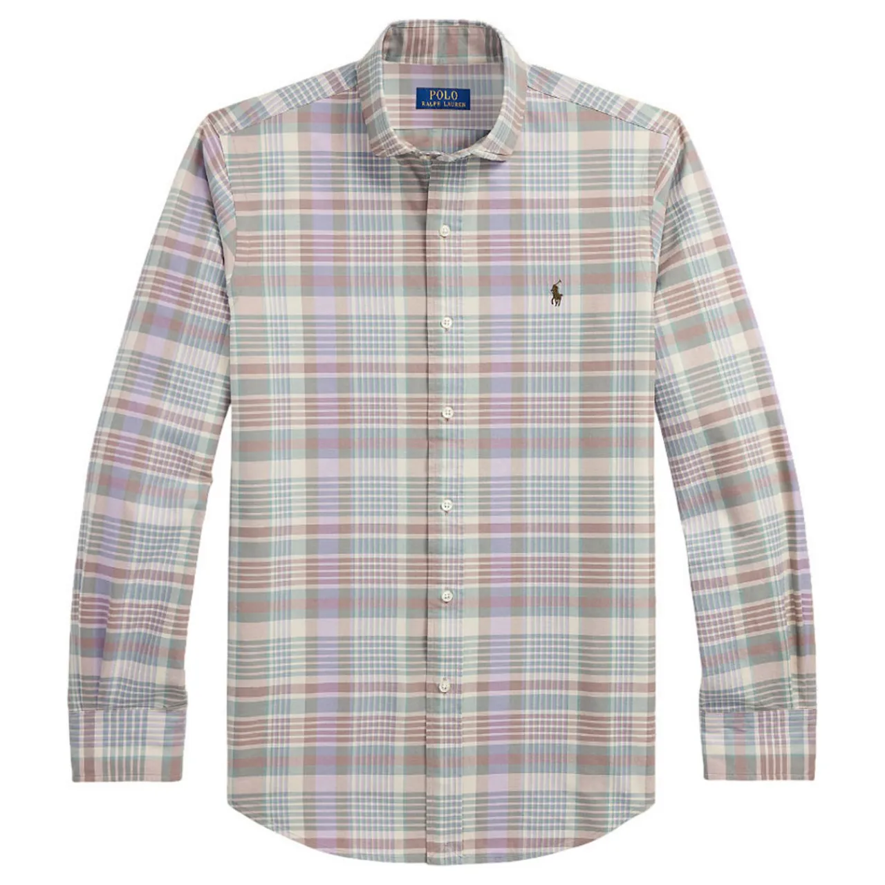- Check pattern, button-down collar, long sleeves, button fastenings, logo detail, curved hemline