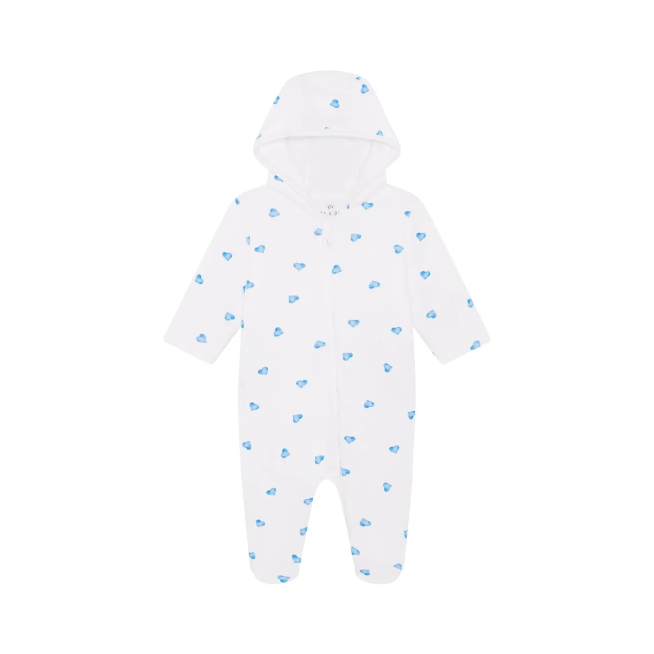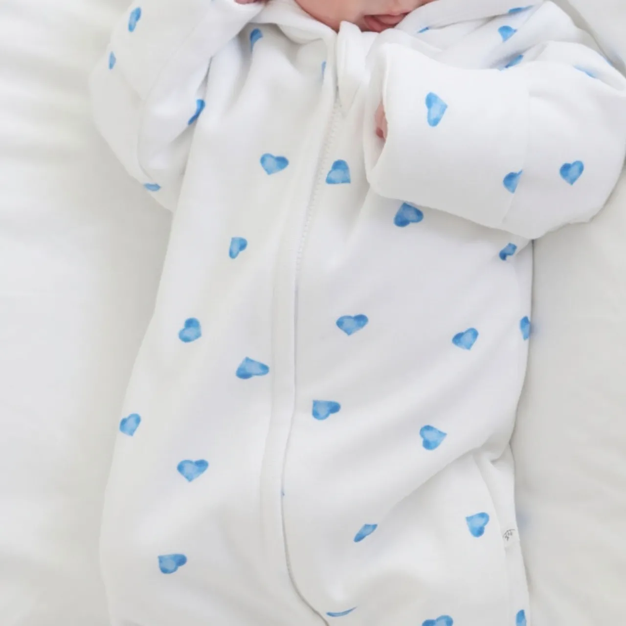 - Signature soft bamboo-cotton fabric, padded hood, concealed zip fastening, fold-over scratch mitts, hand-painted watercolour heart print