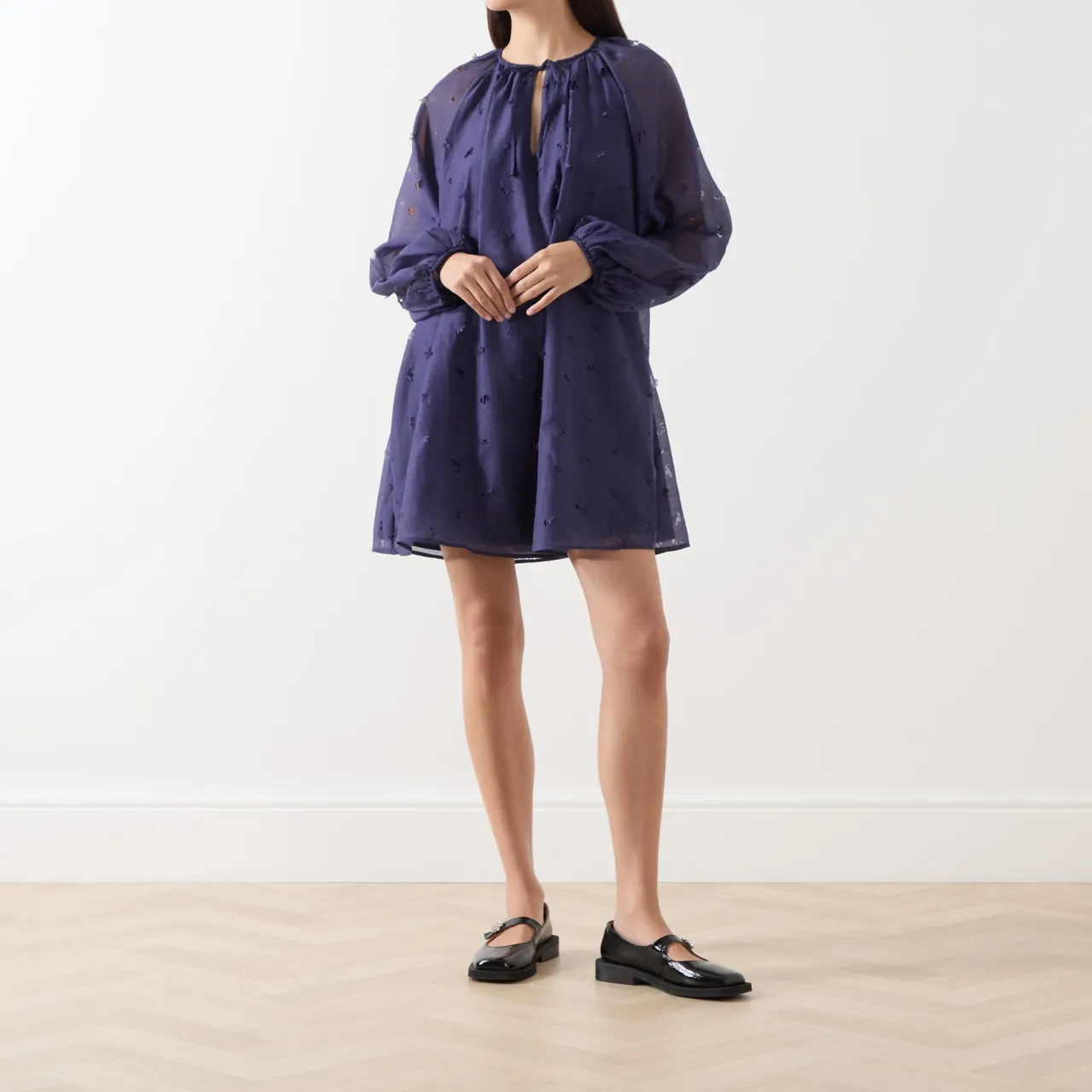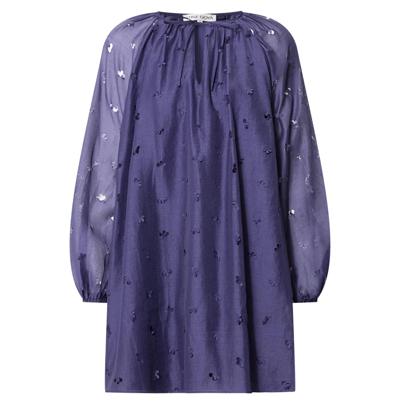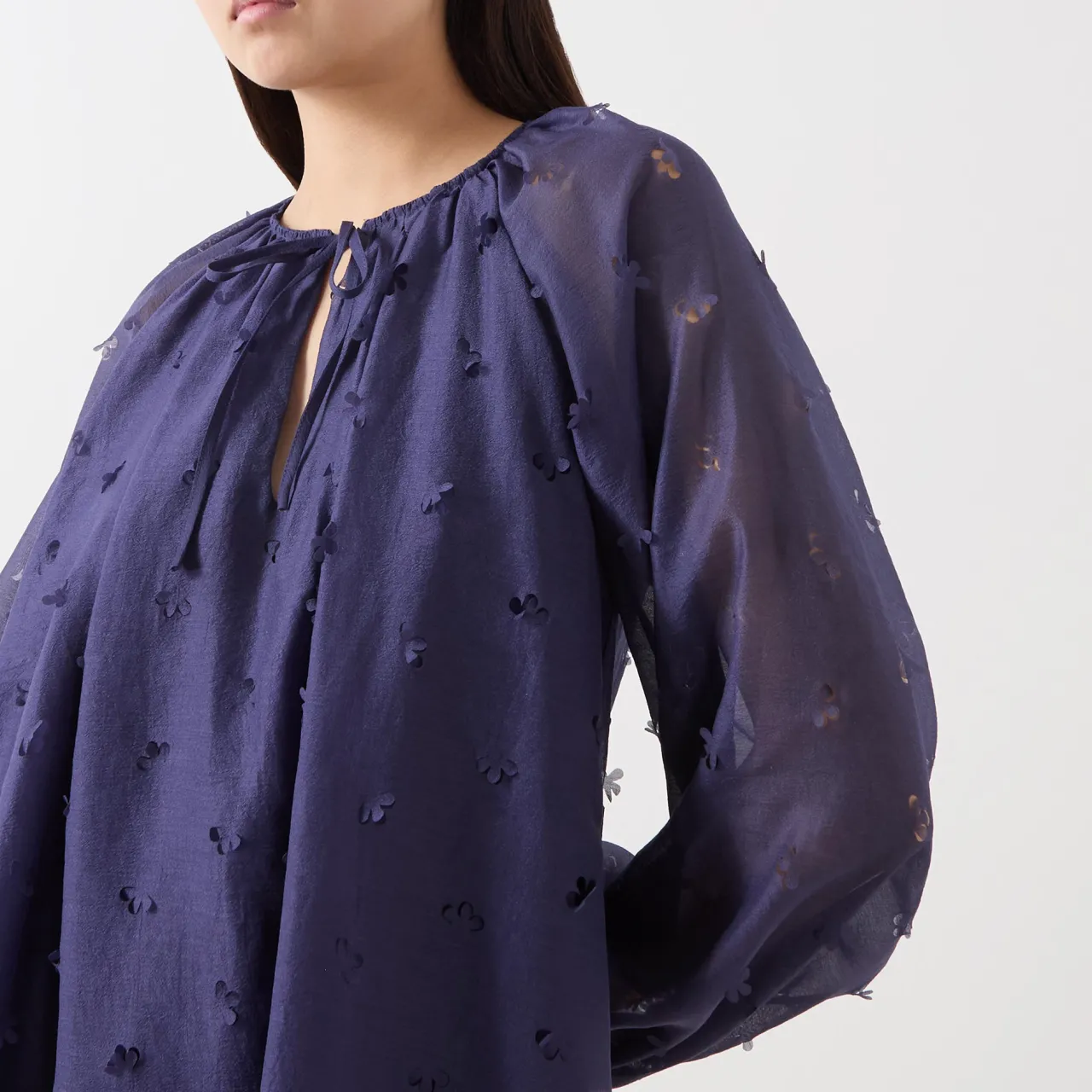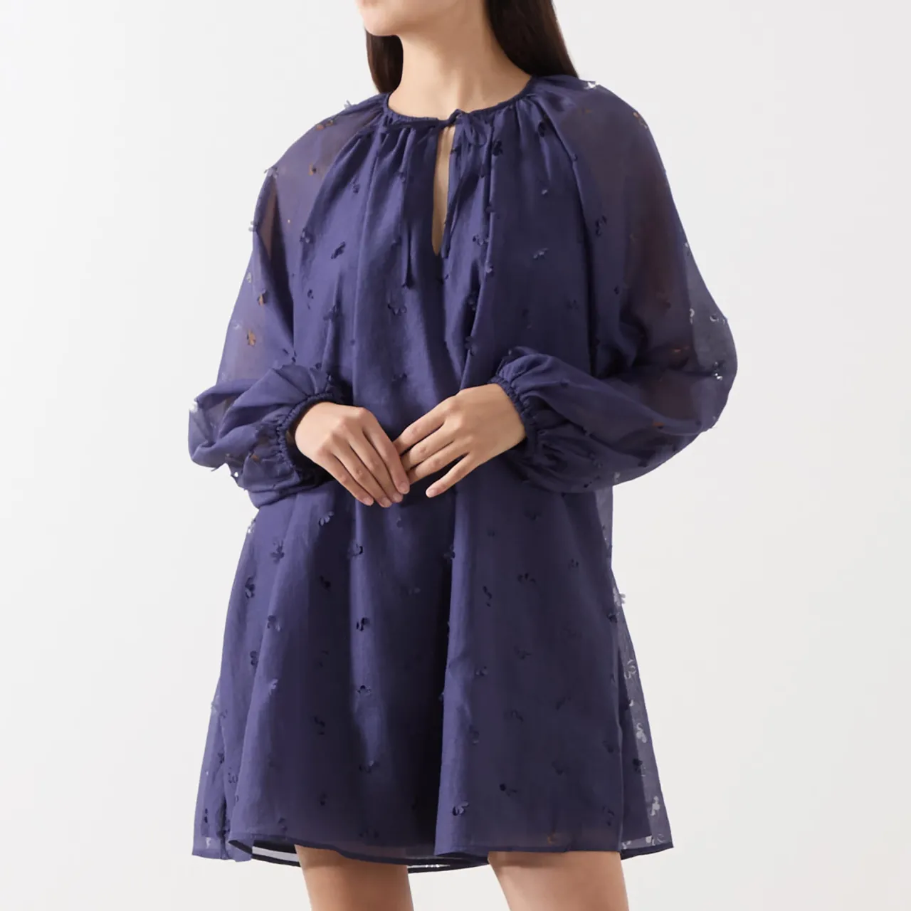 - Round neckline with keyhole and tie fastening, long balloon sleeves, elasticated cuffs, flared hem, semi-sheer finish with delicate laser-cut floral detailing, mini length